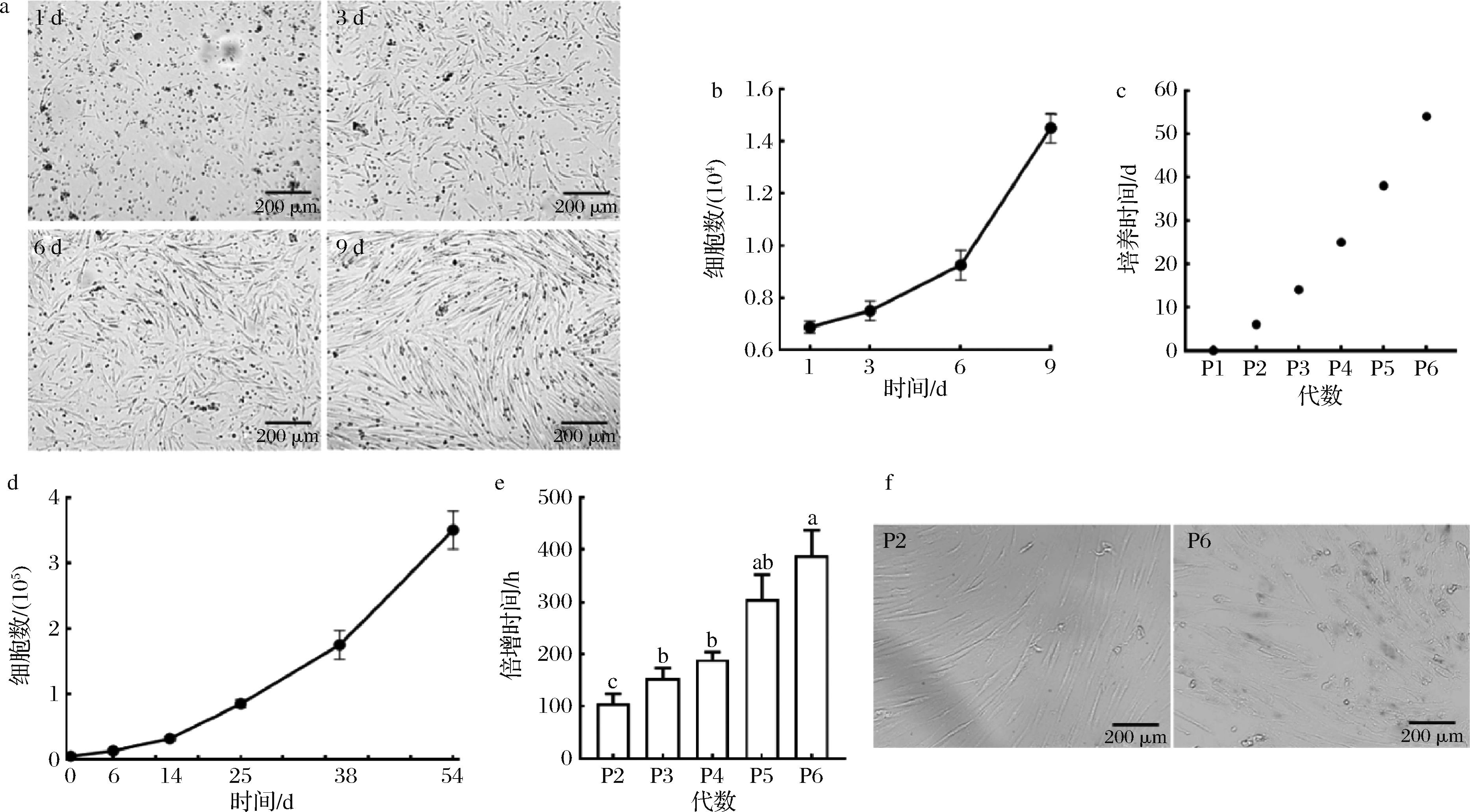 a-初始分离的前脂肪细胞培养1~9 d的细胞显微形态;b-初始分离的前脂肪细胞的生长曲线;c-前脂肪细胞体外培养时间与细胞代数的对应关系;d-前脂肪细胞连续传代的增殖曲线;e-前脂肪细胞连续传代的倍增时间;f-前脂肪细胞P2和P6的β-半乳糖苷酶衰老染色情况