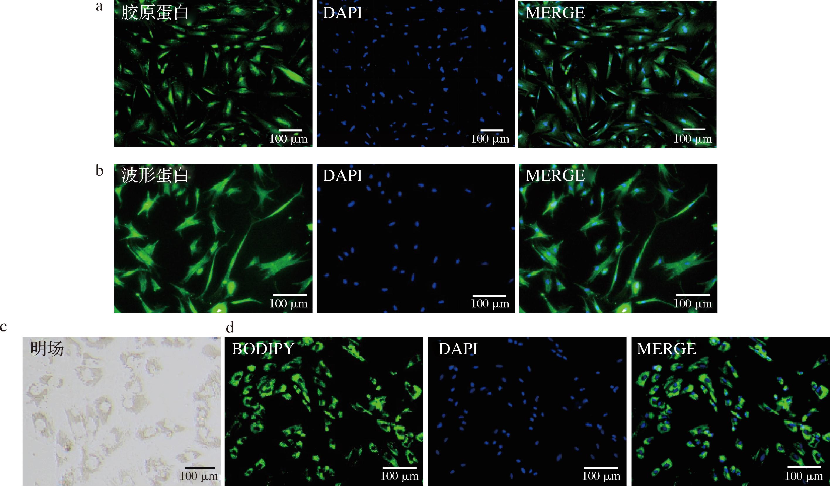 a-胶原蛋白免疫荧光染色图像;b-波形蛋白免疫荧光染色图像;c-成脂诱导9 d的前脂肪细胞显微形态;d-成脂诱导9 d的前脂肪细胞的脂滴染色荧光图像