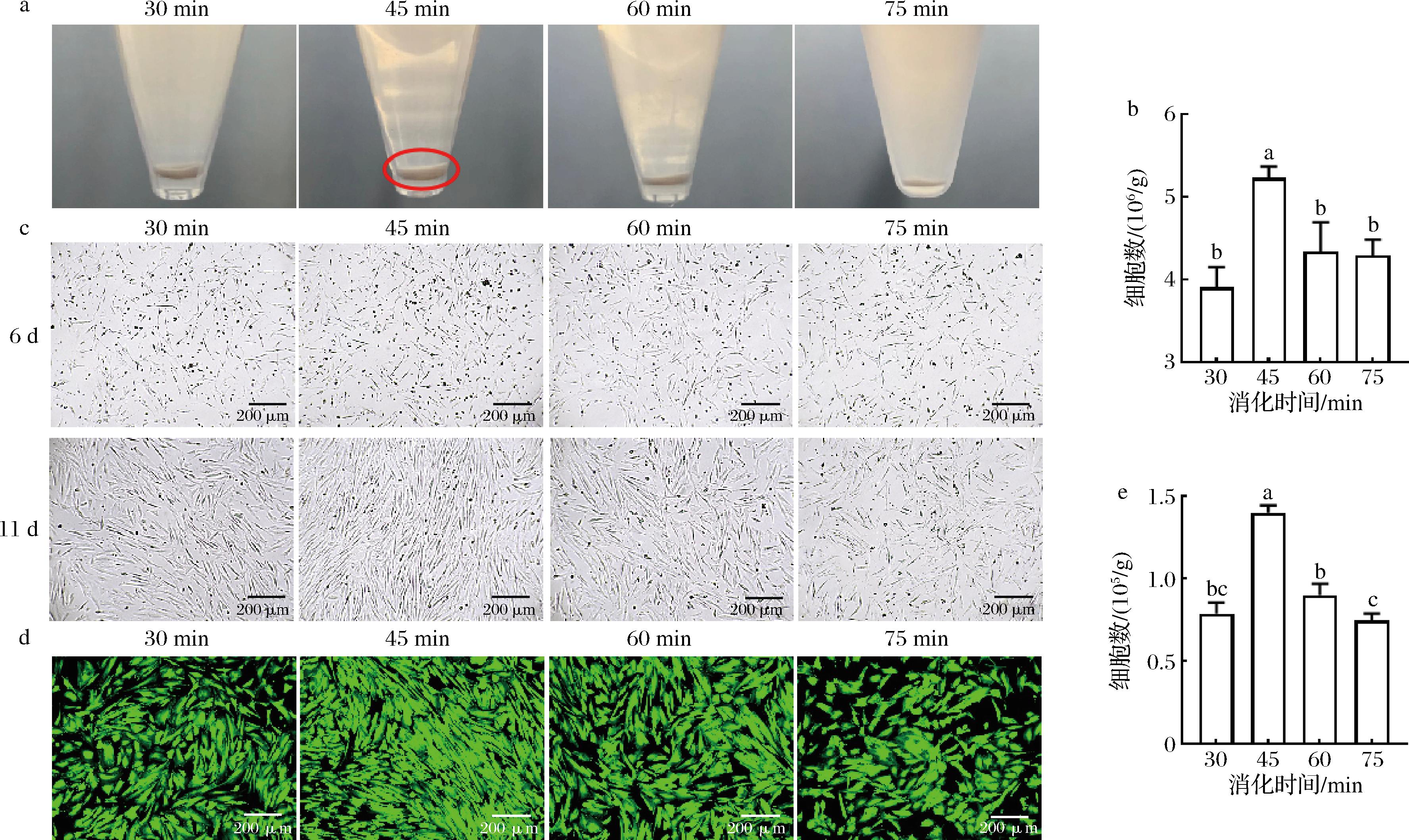 a-细胞沉淀照片;b -细胞的初始数量;c-细胞的显微形态;d-细胞培养11 d后的活细胞染色;e-细胞培养11 d后的活细胞数
