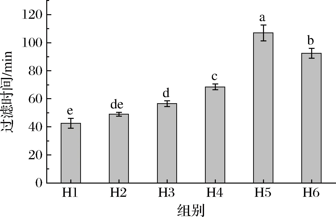 注:H1(对照组)、H2、H3、H4、H5、H6分别为添加0、20%、40%、60%、80%、100%(质量分数)青稞麦芽(下同);图中不同小写字母表示差异显著(P<0.05)(下同)。