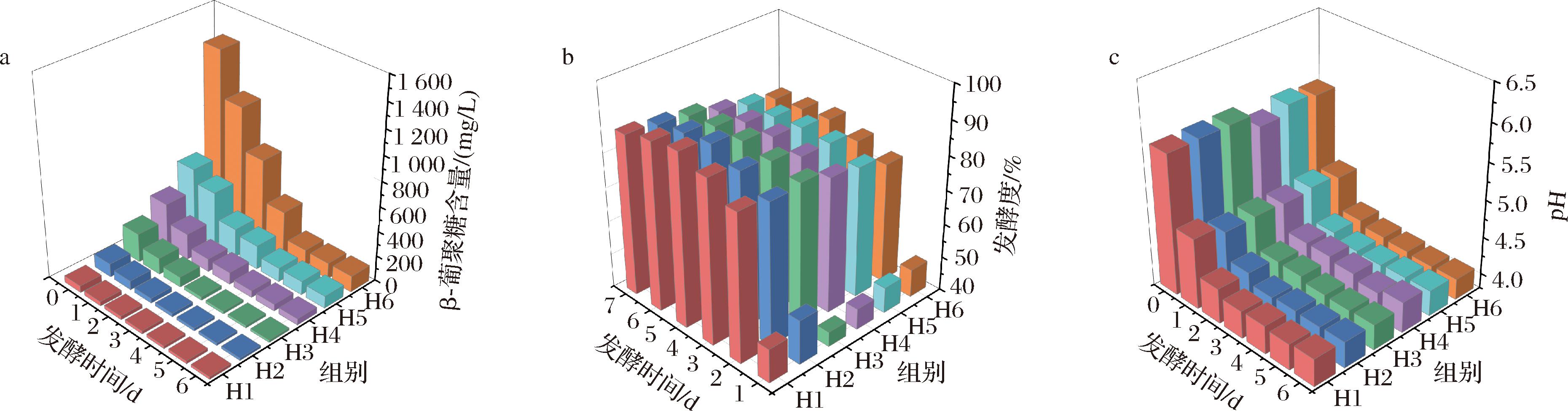 啤酒中β-葡聚糖含量的高低取决于麦芽中β-葡聚糖含量,由图2-a可知,随着青稞麦芽添加比例的增加,各组麦汁中β-葡聚糖含量逐渐升高,100%青稞麦芽汁中β-葡聚糖含量最高,为1 393.94 mg/L。在发酵过程中,随着发酵时间的延长,6组发酵液中的β-葡聚糖含量均减小,这主要是因为β-葡聚糖分子质量较大,发酵过程中受到冷凝物以及酿酒酵母沉降等因素的影响使其含量发生改变[18]。发酵结束后,6组发酵液中β-葡聚糖含量分别为(21.32±0.25)、(20.25±0.62)、(19.34±0.33)、(50.69±1.33)、(97.25±0.95)、(129.48±1.72) mg/L,均符合啤酒中β-葡聚糖控制标准(<150 mg/L)。