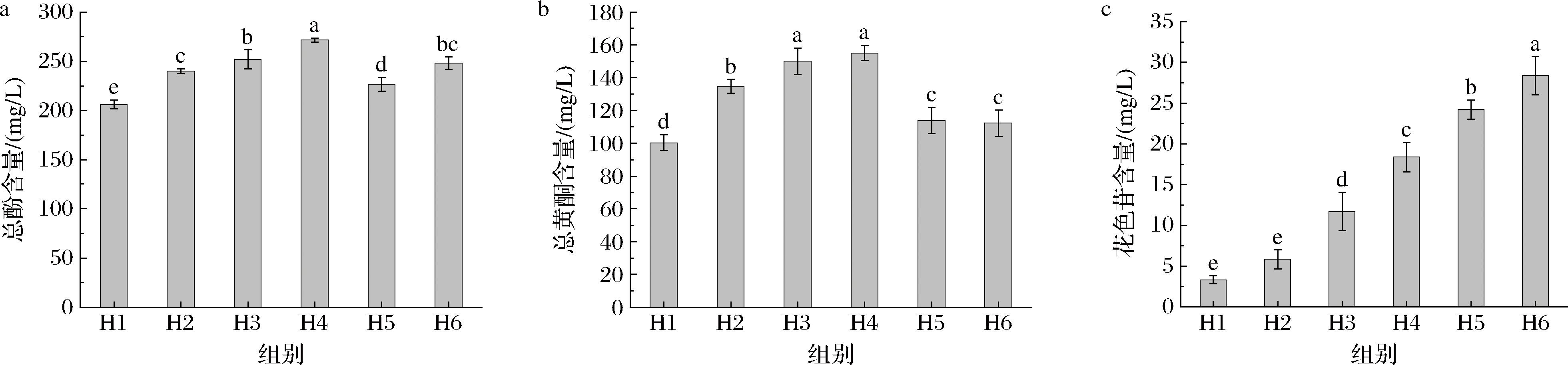 酚类物质会显著影响啤酒颜色和感官特征,如酒体的涩味、苦味和丰满度。基于多酚对啤酒的影响,进一步测定了6组啤酒中的总酚含量。如图3-a所示,6组啤酒中的总酚含量分别为206.22、239.80、251.76、271.52、226.44、247.96 mg/L。与对照组相比,添加青稞麦芽会显著增加啤酒中总酚含量,且随着青稞麦芽添加比例的增加,总酚含量先上升后下降,H4青稞啤酒中总酚含量最高,这是因为啤酒中70%~80%的酚类物质来源于酿造麦芽本身,在发酵过程中,酚类物质会与麦汁和发酵液中蛋白质结合产生浑浊,在后续过滤中会滤掉浑浊物,使得青稞啤酒中的总酚含量减少。