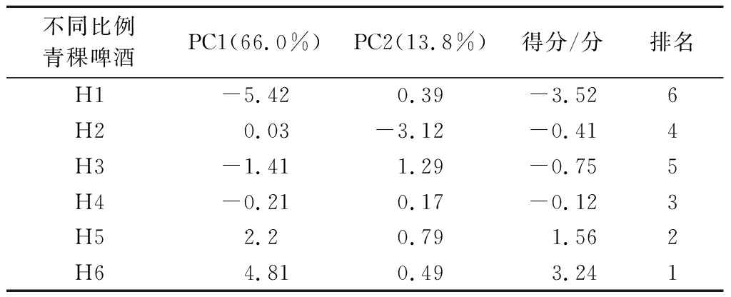 不同比例青稞啤酒PC1(66.0%)PC2(13.8%)得分/分排名H1-5.420.39-3.52 6H20.03-3.12-0.41 4H3-1.411.29-0.75 5H4-0.210.17-0.12 3H52.20.791.56 2H64.810.493.24 1