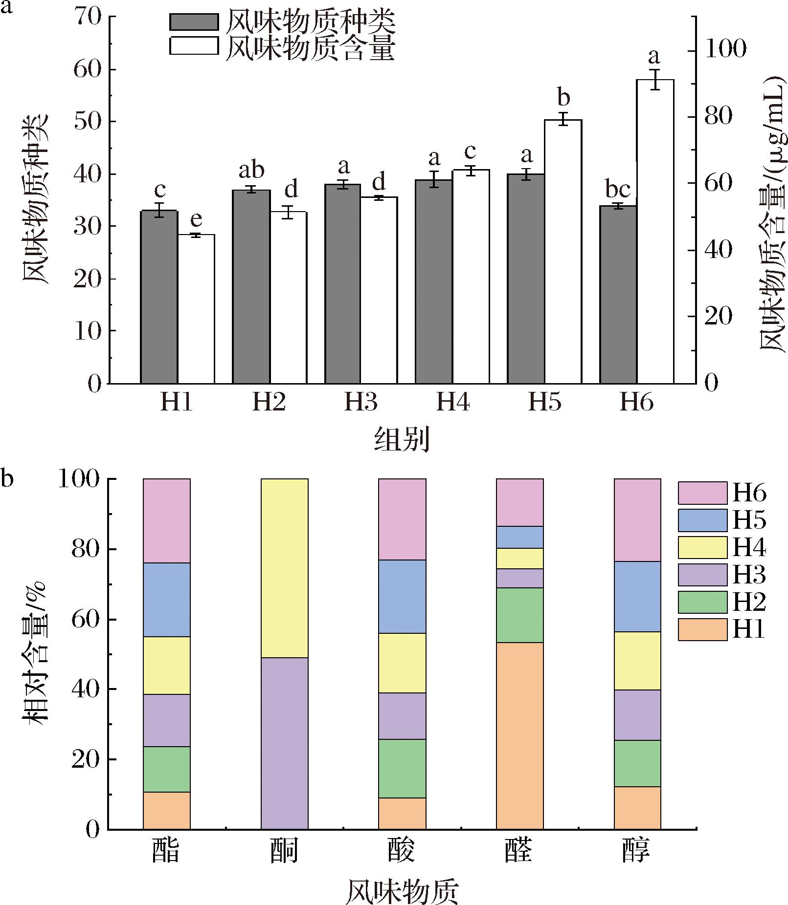 采用HS-SPME-GC-MS技术,对6组啤酒中的风味物质进行定性和定量分析,选取气相色谱相似度(similarity index,SI)≥80,并除去对青稞麦芽风味影响小的烷烃类物质,如图6-a所示,从H1~H6啤酒中分别检测出33、37、38、39、40、34种风味化合物,含量分别为44.62、51.44、55.71、63.99、79.34、91.17 μg/mL。进一步分析发现,添加青稞麦芽的啤酒风味物质含量明显增加,而风味物质种类呈现先增加后减小的趋势,这表明添加适量青稞麦芽对啤酒风味具有显著影响。