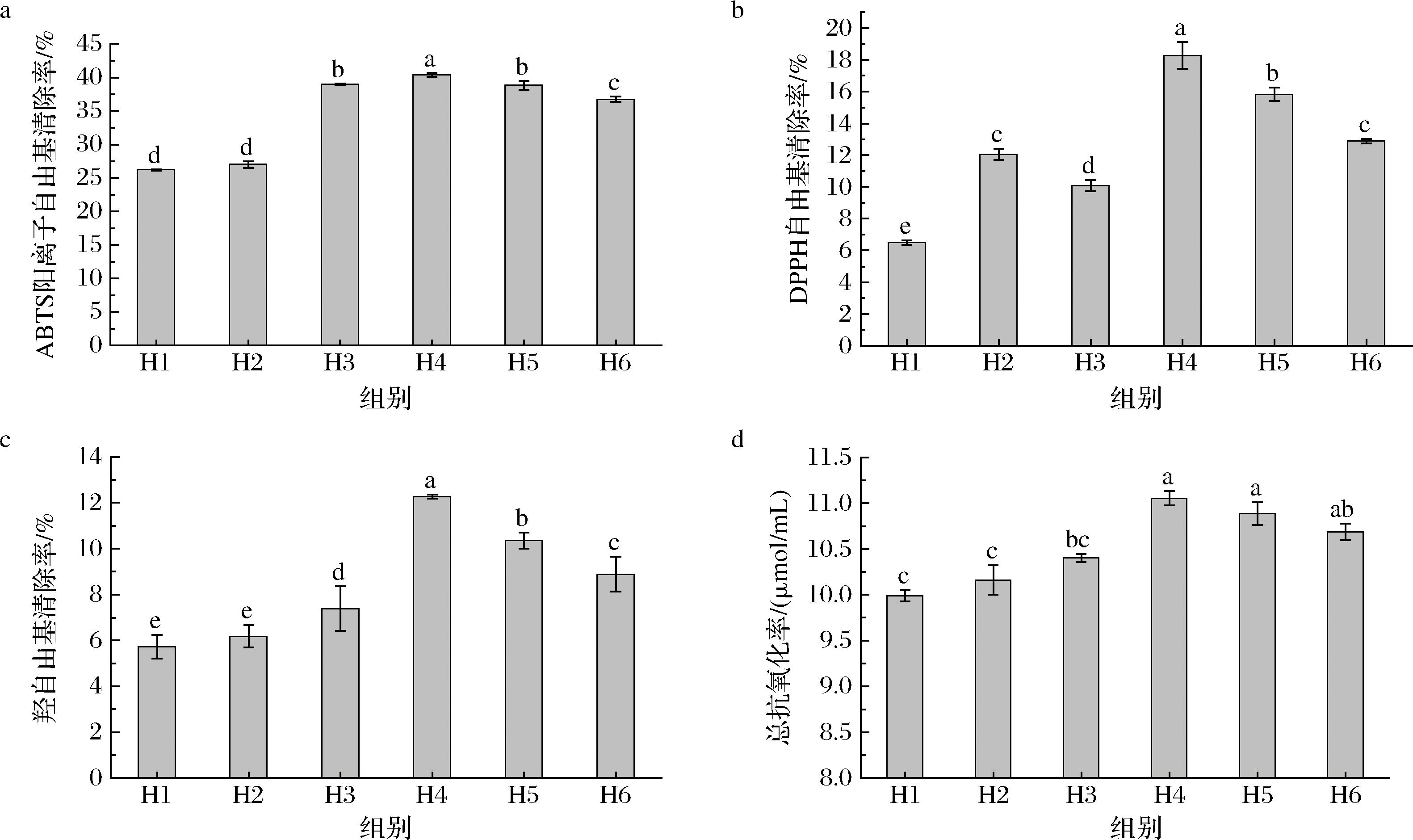 a-ABTS阳离子自由基清除能力;b-DPPH自由基清除能力;c-羟自由基清除能力;d-总抗氧化能力