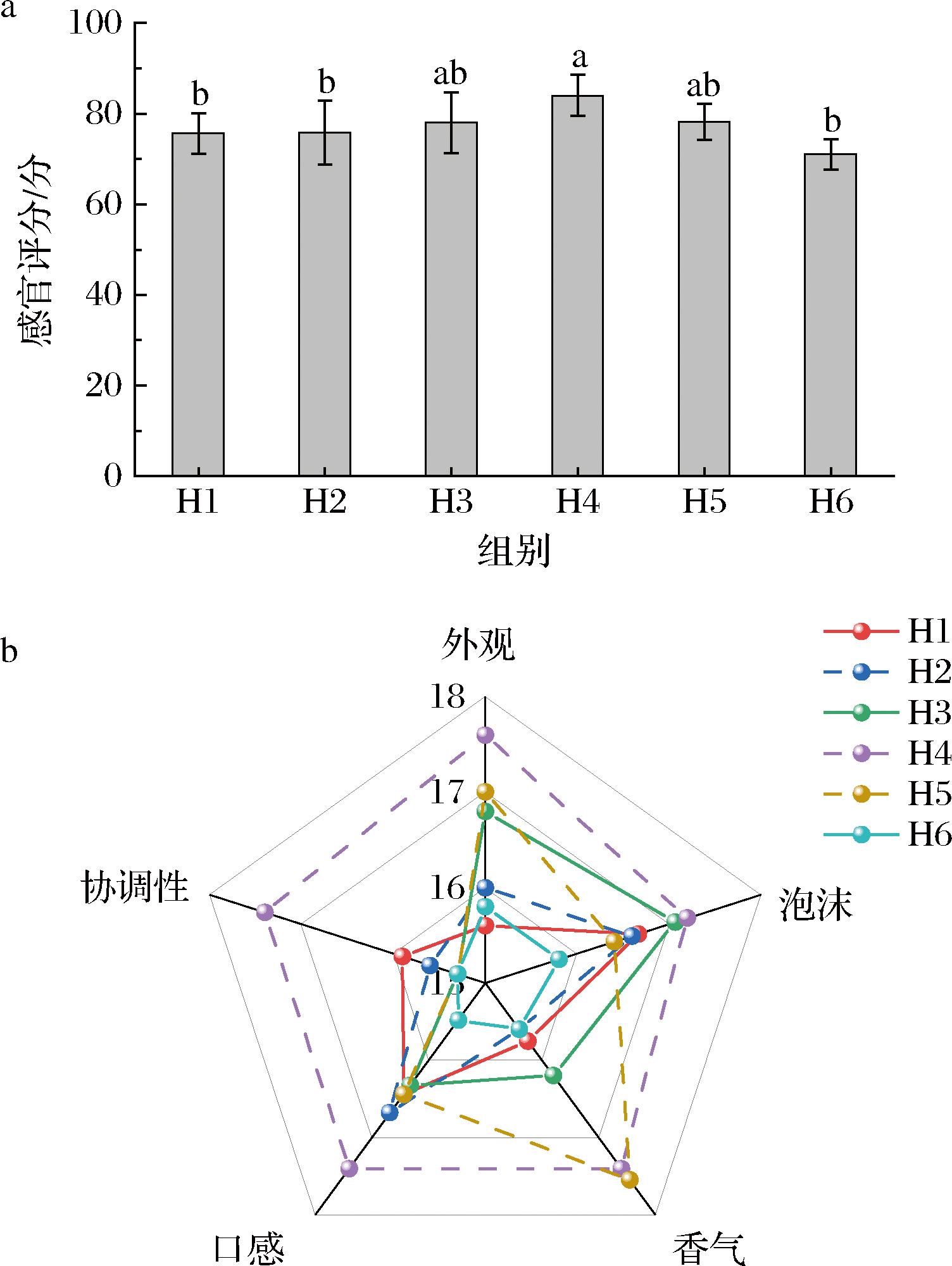 感官评价是最直观体现啤酒质量以及是否获得消费者青睐的重要指标,如图8-a所示,除H6外,添加青稞麦芽的啤酒感官评分均高于未添加青稞麦芽啤酒,其中H4啤酒的感官评分最高,为84分。由图8-b可知,在啤酒外观方面,6组青稞啤酒均不存在明显悬浮物,H6色度和浊度最高,H1颜色暗淡,故而得分较低;在泡沫方面,H4泡沫洁白细腻厚实,得分最高,这与其良好的泡持性和起泡性密切相关,也可能与多酚含量相关[32]。在香气方面,H4和H5有明显的麦芽香和酒花香气,且香气浓郁醇厚,得分较高,这可能与风味物质种类和含量相关;在口感方面,得分最高的是H4和H2,其口味纯正爽淡,无异味,H5和H6酒体中略有酸味;在协调性方面,H6得分最低,H4得分较高,这可能与醇酯等风味物质的控制密切相关[33]。综上,添加青稞麦芽能够增加啤酒的口感和风味,添加比例为60%(质量分数)时啤酒香气浓郁且具有独特的青稞麦芽风味。