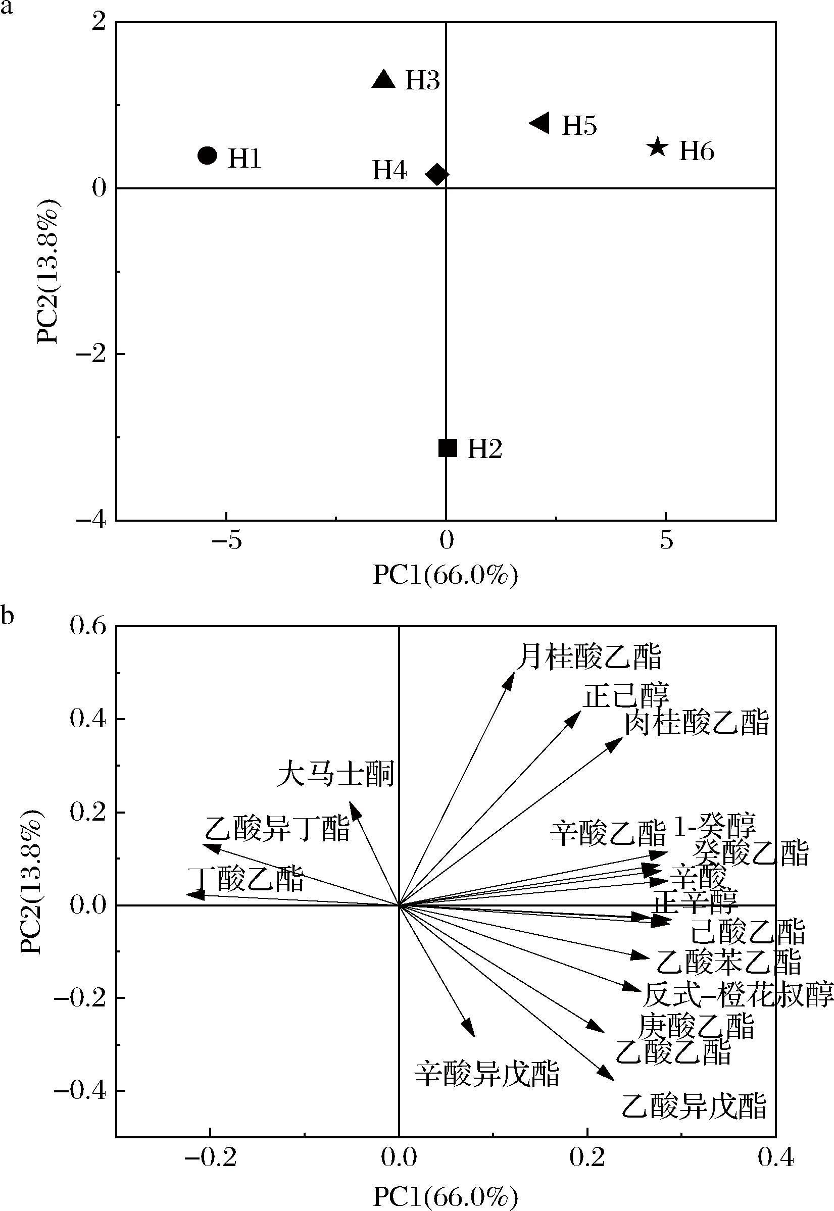 为进一步揭示不同比例青稞啤酒的风味差异性,采用主成分分析法(principal component analysis,PCA)分析了6组啤酒OAV>1的18种关键风味化合物,结果见图7。PC1和PC2方差贡献率分别为66.01%和13.8%,累计方差贡献率为79.81%,足以区分不同比例青稞啤酒的风味特征。由图7-a可知,PC1方差贡献率最高,其中,H1、H4、H3位于PC1负半轴,H5、H6位于PC1正半轴,说明H5、H6与H1、H4、H3啤酒风味差异性较大。另外,由表3可知,随着青稞麦芽添加比例的增加,青稞啤酒综合得分也随之提升,说明添加青稞麦芽可丰富啤酒风味,提升啤酒口感。由图7-b可知,H1、H4、H3风味综合表征点位于第二象限,与丁酸乙酯、乙酸异丁酯、大马士酮相关性较高,主要呈现苹果味、甜味和玫瑰味。H5、H6风味综合表征点位于第一象限,与月桂酸乙酯、正己醇、肉桂酸乙酯、辛酸乙酯、1-癸醇、癸酸乙酯、辛酸相关性较高,主要呈现花香味、奶油味、橙子味。