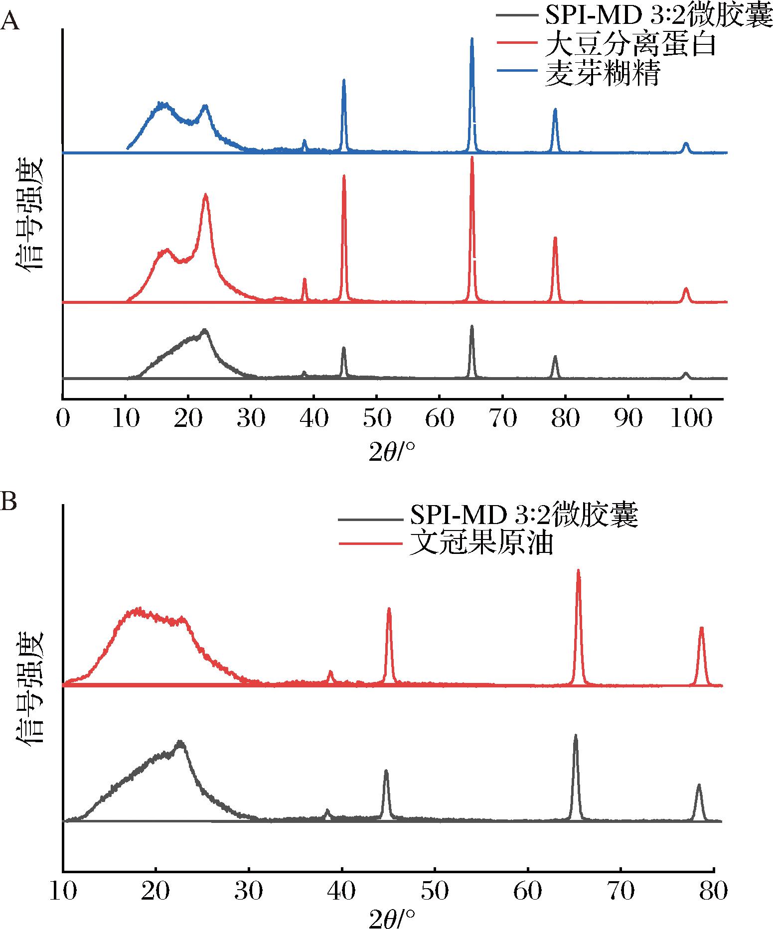 研究表明,当新的包合物形成后不仅晶型发生改变,分子结构也发生改变,从而形成新的物象。通过XRD分析了微胶囊粉末及其壁材和芯材的结晶度。如图5所示,在2θ=20°附近出现了一个宽峰,表明所有样品都处于非晶相,微胶囊衍射峰的出峰位置与单独的SPI和MD基本一致。TAO等[21]用麦芽糖糊精和乳清分离蛋白包埋蓝莓花色苷,通过冷冻干燥的方法制得微胶囊,认为壁材类型不会影响胶囊粉末的结晶度。