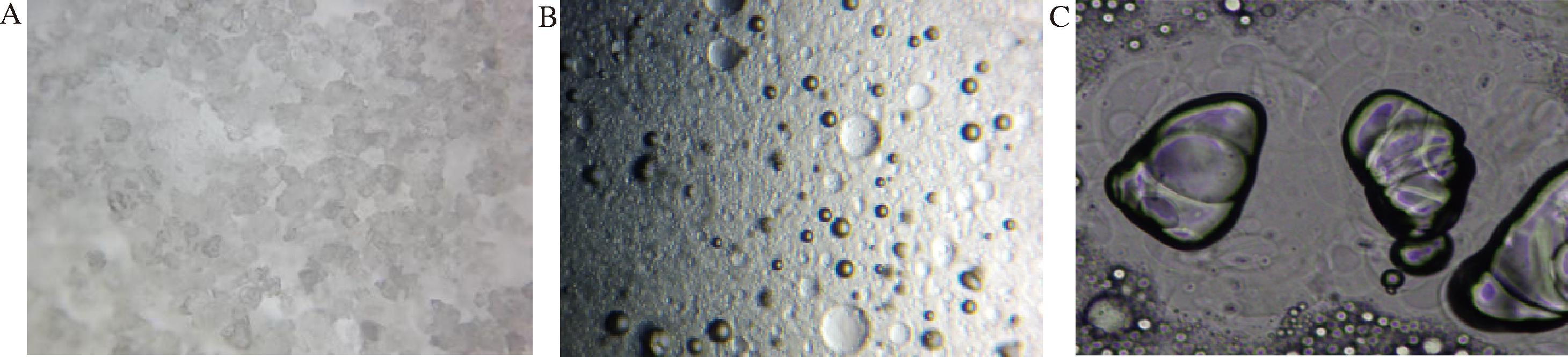 如图6-A显微镜观察结果所示,文冠果油微胶囊的形态为不规则结晶状,边缘颜色较深。如图6-B所示,溶解后的微胶囊乳液边缘颜色较深,中心透明的气泡状物体可能是文冠果油微胶囊的水包油液滴,深色部分明显较厚,推断壁材对文冠果油包埋效果较好,溶于水后缓慢释放所致。如图6-C共聚焦激光扫描显微镜观察结果所示,微胶囊乳液液滴为不规则型,根据油脂在强光下反射出的光线判断,液滴不规则状的原因可能是若干圆形液滴的重合所导致。另一方面,由于冷冻干燥过程中内部失水速度较快,因此微胶囊的表面可能会呈现出凹陷或褶皱。周鑫等[22]通过喷雾干燥制备核桃油微胶囊在表观中同样发现部分微胶囊表面出现褶皱。同时,微胶囊的表面并无破裂或破洞现象,说明壁材起到很好的保护和支撑作用。