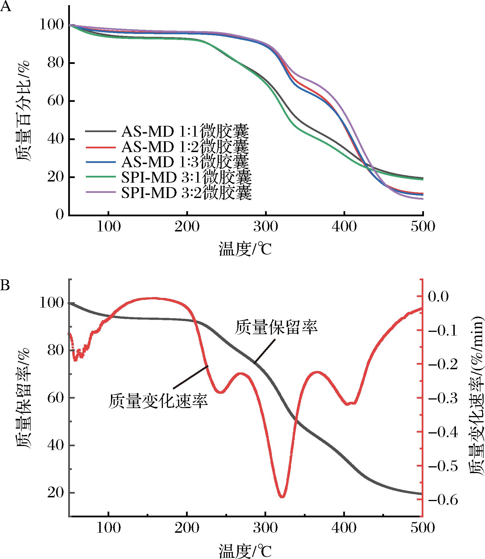 通过测定样品在升温过程中的质量变化和高温加热过程的逐步降解过程,可评价微胶囊的热稳定性[20]。如图4-A所示,SPI-MD 3∶2质量百分比高于其他组别,表明这一壁材组合制得的微胶囊不仅能保护文冠果油,而且比其他组别的方法更有效。如图4-B所示,文冠果油微胶囊热降解过程大致分为3个阶段:第一阶段的质量损失主要是水分的蒸发和挥发性物质的损失;第二阶段主要是壁材分解,这一阶段前半部分主要分解SPI,后半部分分解MD曲线较平缓,表明SPI-MD组的壁材不易分解,稳定性相对较好;第三阶段质量损失最小,微胶囊最终残留量明显高于文冠果油,表明将文冠果油制成微胶囊具有良好的保护作用。综合3个阶段结果,文冠果油微胶囊在220 ℃之前具有较为稳定的结构,热稳定性较好,适用于食品加工生产。