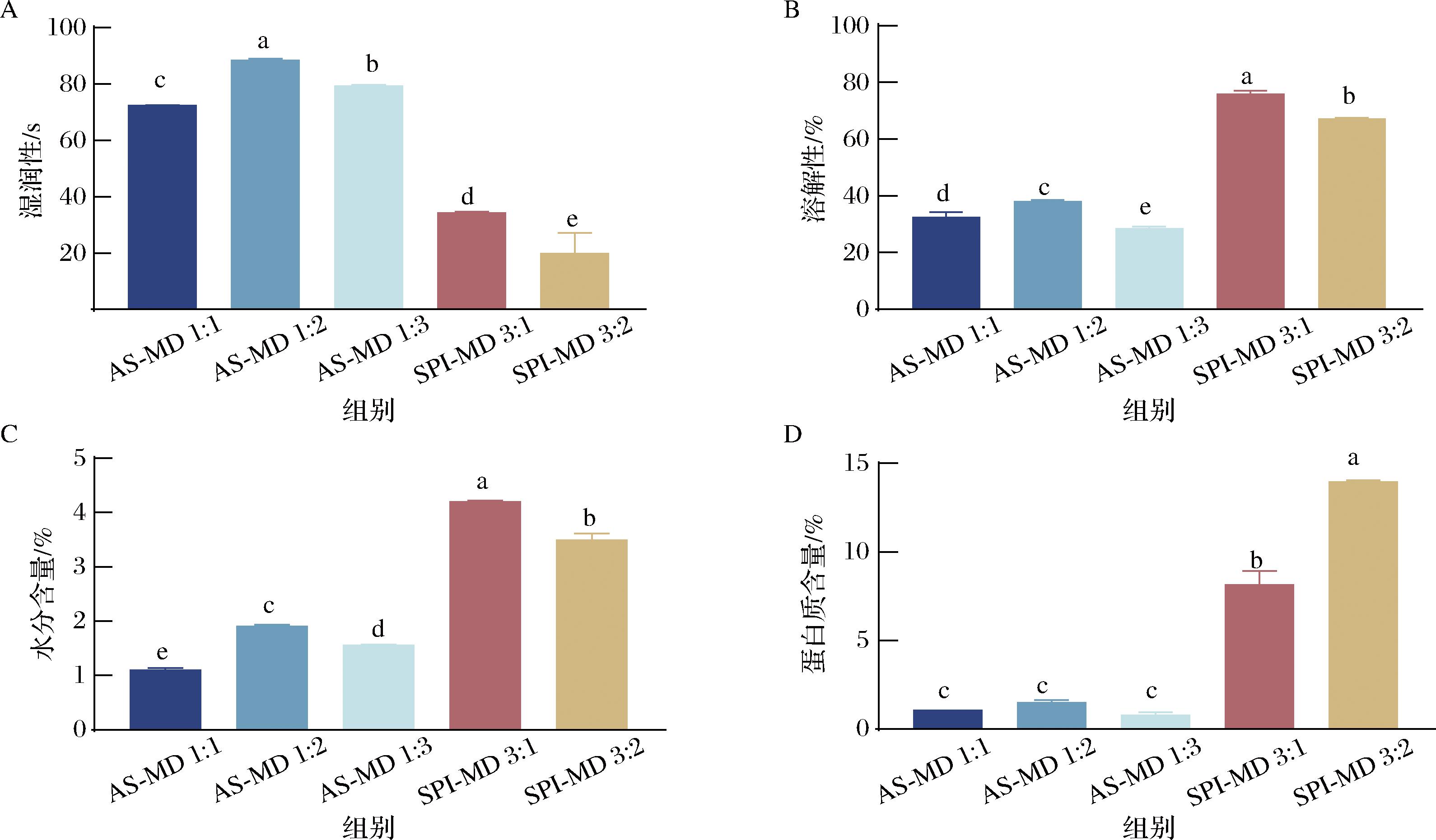 A-湿润性;B-溶解性;C-水分含量;D-蛋白质含量