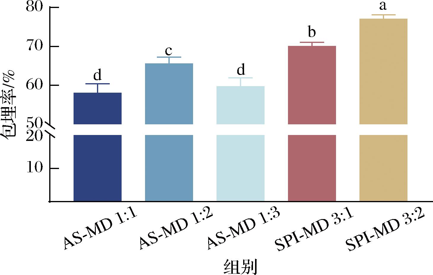 如图1所示,AS-MD组微胶囊包埋率明显低于SPI-MD组,且不同壁材比例条件下制备的微胶囊包埋率差异较大;SPI-MD组的微胶囊包埋率相对较高,其中SPI-MD 3∶2比例时最高可达77.09%,表明SPI-MD 3∶2微胶囊的包埋效果最好,微胶囊的稳定性和缓释性能更好[15]。高包埋率不仅抑制了次级氧化产物的生成,而且在外界环境和文冠果油之间形成物理屏障,阻碍了文冠果油风味的挥发和释放,进而可以实现文冠果油的高品质保存。