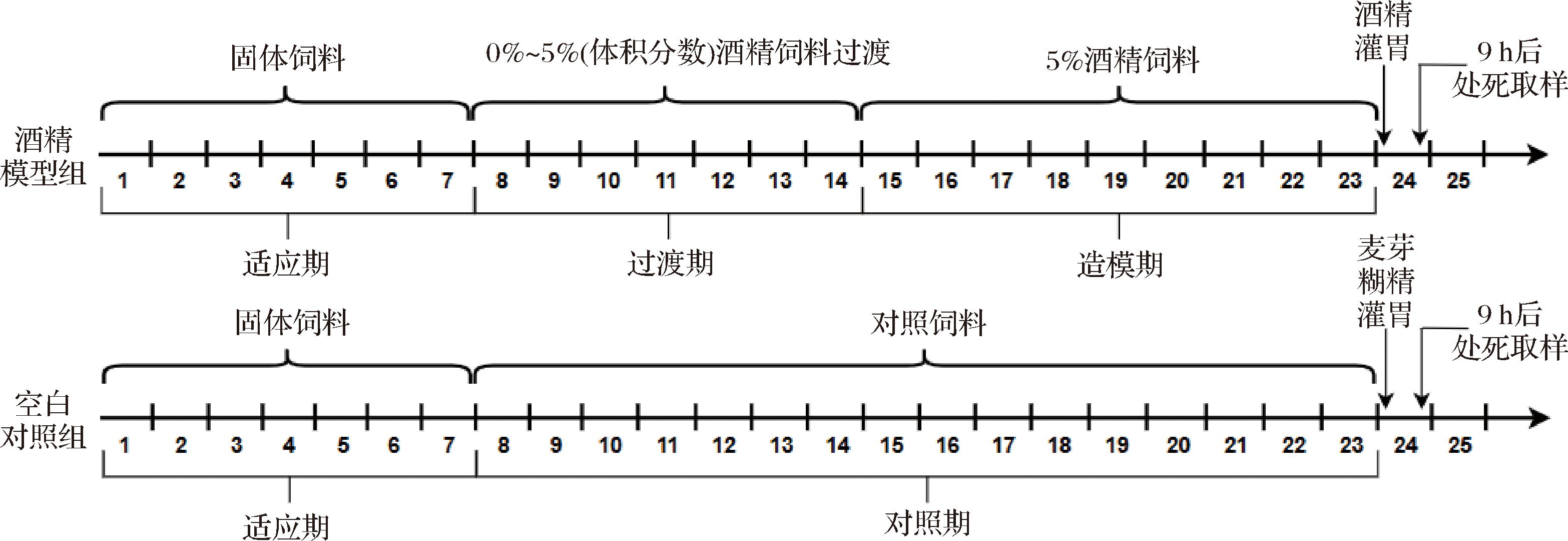 第24天按照1.3.1节中的剂量给各组小鼠进行最后一次阳性及样品干预,空白组和模型组灌等量的生理盐水。30 min后,除空白组外均灌胃12 mL/kg BW 体积分数为45%食用乙醇溶液,空白组灌胃等热量的麦芽糖糊精,经 9 h的禁食后用异氟烷麻醉。采用眼球后静脉丛取血的方法收集小鼠血液。取血结束后,脱颈处死小鼠并解剖,切下肝脏分成2份。将其一部分固定在4%(体积分数)多聚甲醛溶液中,而其余部分在液氮中快速冷冻并贮存在-80 ℃冰箱。