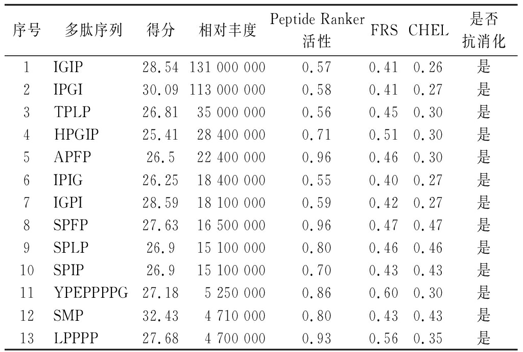 序号多肽序列得分相对丰度Peptide Ranker活性FRSCHEL是否抗消化1IGIP28.54131 000 0000.570.410.26是2IPGI30.09113 000 0000.580.410.27是3TPLP26.8135 000 0000.560.450.30是4HPGIP25.4128 400 0000.710.510.30是5APFP26.522 400 0000.960.460.30是6IPIG26.2518 400 0000.550.400.27是7IGPI28.5918 100 0000.590.420.27是8SPFP27.6316 500 0000.960.470.47是9SPLP26.915 100 0000.800.460.46是10SPIP26.915 100 0000.700.430.43是11YPEPPPPG27.185 250 0000.860.600.30是12SMP32.434 710 0000.800.430.43是13LPPPP27.684 700 0000.930.560.35是