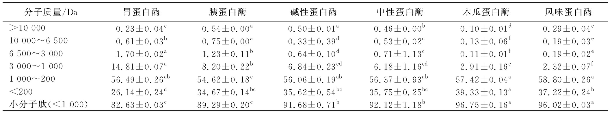 分子质量/Da胃蛋白酶胰蛋白酶碱性蛋白酶中性蛋白酶木瓜蛋白酶风味蛋白酶>10 0000.23±0.04c0.54±0.00a0.50±0.01a0.46±0.00b0.10±0.01d0.29±0.04c10 000~6 5000.61±0.03b0.75±0.00a0.33±0.39d0.53±0.02c0.13±0.06f0.19±0.03e6 500~3 0001.70±0.02a1.23±0.11b0.64±0.10d0.71±1.13c0.11±0.01f0.19±0.02e3 000~1 00014.81±0.07a8.20±0.22b6.84±0.23cd6.18±1.16cd2.91±0.16e2.32±0.07f1 000~20056.49±0.26ab54.62±0.18c56.06±0.19ab56.37±0.93ab57.42±0.04a58.80±0.26a<20026.14±0.24d34.67±0.14bc35.62±0.54bc35.75±0.25bc39.33±0.13a37.22±0.24b小分子肽(<1 000)82.63±0.03c89.29±0.20c91.68±0.71b92.12±1.18b96.75±0.16a96.02±0.03a