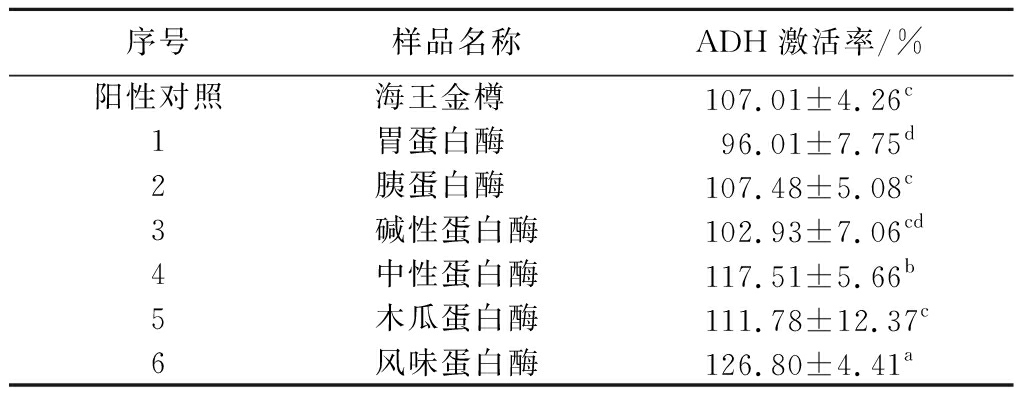 序号样品名称ADH激活率/%阳性对照海王金樽 107.01±4.26c1胃蛋白酶 96.01±7.75d2胰蛋白酶 107.48±5.08c3碱性蛋白酶102.93±7.06cd4中性蛋白酶117.51±5.66b5木瓜蛋白酶111.78±12.37c6风味蛋白酶126.80±4.41a