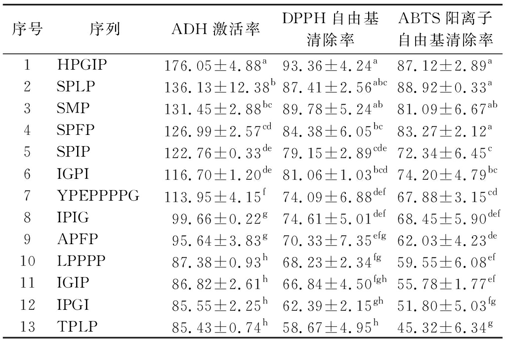 序号序列ADH激活率DPPH自由基清除率ABTS阳离子自由基清除率1HPGIP176.05±4.88a93.36±4.24a87.12±2.89a2SPLP136.13±12.38b87.41±2.56abc88.92±0.33a3SMP131.45±2.88bc89.78±5.24ab81.09±6.67ab4SPFP126.99±2.57cd84.38±6.05bc83.27±2.12a5SPIP122.76±0.33de79.15±2.89cde72.34±6.45c6IGPI116.70±1.20de81.06±1.03bcd74.20±4.79bc7YPEPPPPG113.95±4.15f74.09±6.88def67.88±3.15cd8IPIG99.66±0.22g74.61±5.01def68.45±5.90def9APFP95.64±3.83g70.33±7.35efg62.03±4.23de10LPPPP87.38±0.93h68.23±2.34fg59.55±6.08ef11IGIP86.82±2.61h66.84±4.50fgh55.78±1.77ef12IPGI85.55±2.25h62.39±2.15gh51.80±5.03fg13TPLP85.43±0.74h58.67±4.95h45.32±6.34g