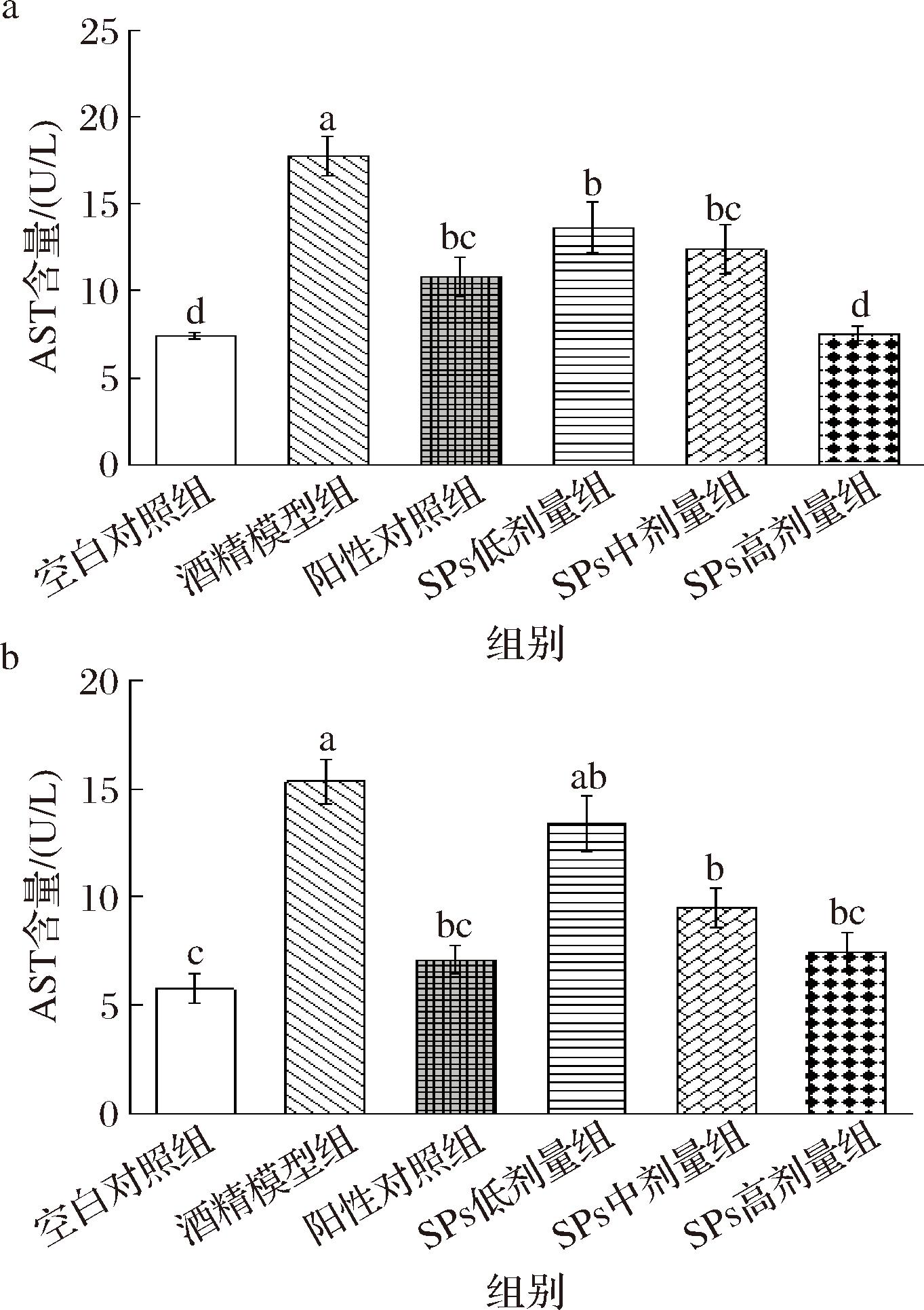 与空白组相比,酒精模型组中小鼠血清ALT和AST含量显著升高(P<0.05),表明小鼠肝细胞已经严重受损。SPs高剂量组的AST活力和ALT活力较酒精模型组分别减少了40.27%和43.63%,并且与空白对照组比较,没有显著差异(P>0.05)。由实验结果可知,SPs干预对小鼠早期ALD受损肝细胞具有一定的保护作用。