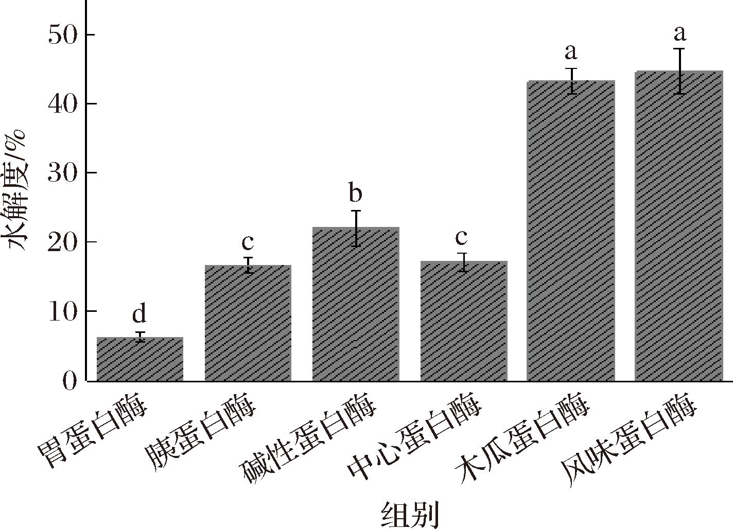 蛋白质水解时释放的肽的各种生物活性取决于蛋白质的种类、水解度以及蛋白酶的特异性等,MORAIS等[23]发现水解度和游离氨基酸含量之间存在显著相关性。采用OPA法对不同酶的水解度进行比较,结果如图2所示。