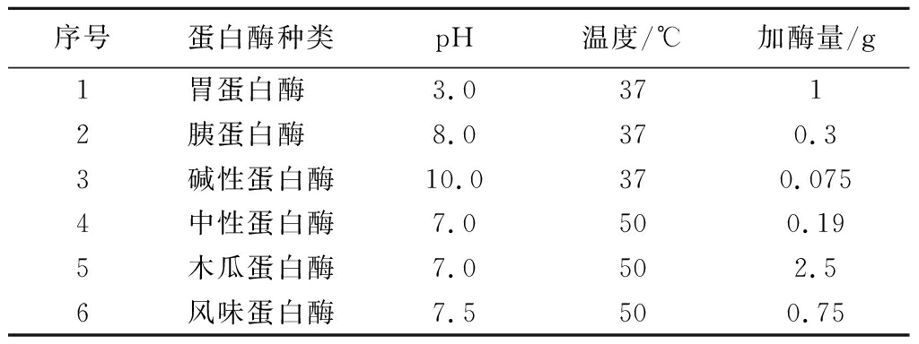 序号蛋白酶种类pH温度/℃加酶量/g1胃蛋白酶 3.03712胰蛋白酶 8.0370.33碱性蛋白酶10.0370.0754中性蛋白酶7.0500.195木瓜蛋白酶7.0502.56风味蛋白酶7.5500.75
