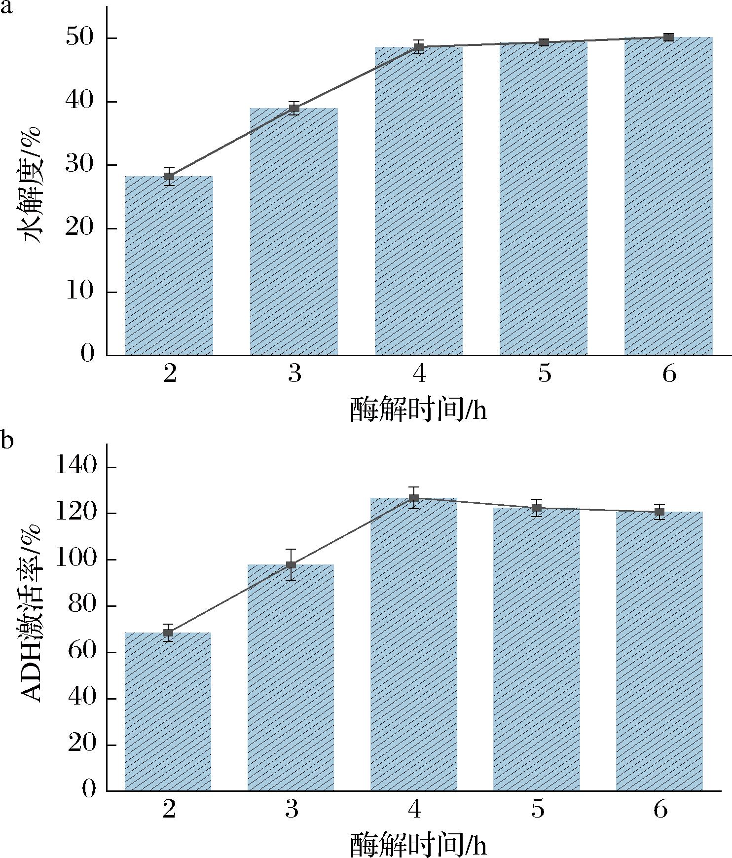 综合水解度、抗氧化活性、体外ADH激活率及分子量分布4个指标,选取风味蛋白酶作为水解螺旋藻的优势蛋白酶。在风味蛋白酶的最适温度和pH条件下,对风味蛋白酶酶解SPs的时间进行优化(2、3、4、5、6 h)。测定酶解产物的水解度及ADH激活率,结果如图4所示。