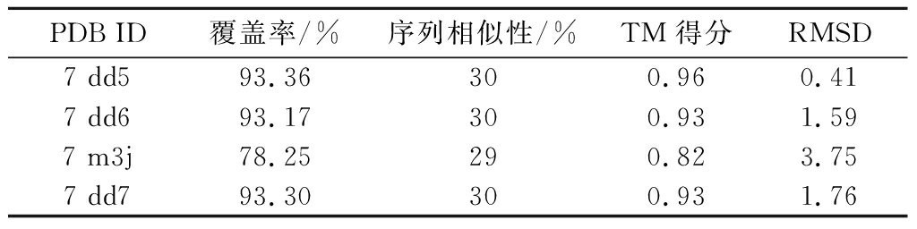 PDB ID覆盖率/%序列相似性/%TM得分RMSD7 dd593.36 300.960.417 dd693.17 300.931.597 m3j78.25 290.823.757 dd793.30 300.931.76