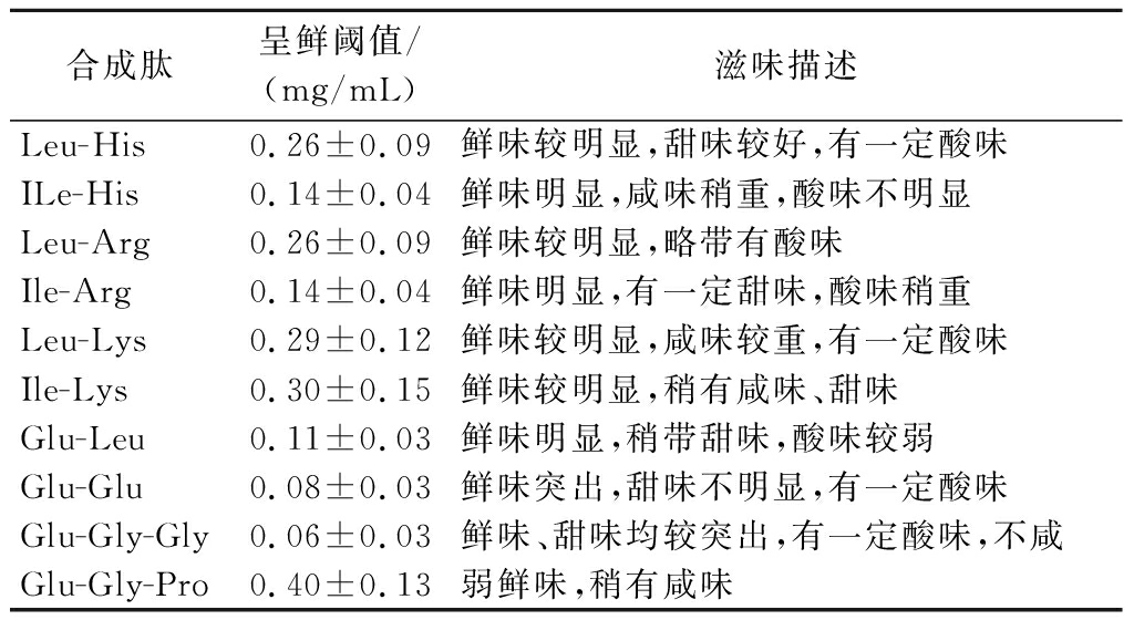 对委外合成的10条小肽进行感官评价,结果如表1所示。各小肽的呈鲜阈值存在较大的区别:其中三肽Glu-Gly-Gly的呈鲜阈值最低,为0.06 mg/mL,明显低于味精呈鲜阈值(0.3 mg/mL)。其次为二肽Glu-Glu、Glu-Leu、Ile-His以及Ile-Arg:具体呈鲜阈值为0.08~0.14 mg/mL。另外,三肽Glu-Gly-Pro的呈鲜阈值则处于偏高水平,达到了0.4 mg/mL,高于味精的呈鲜阈值。而Leu-His、Leu-Arg、Leu-Lys则呈现稍低于味精的呈鲜阈值的情况,Ile-Lys的呈鲜阈值则与味精一致。同时,从鉴评人员的滋味描述来看,所有的小肽均未表现出苦味,而呈鲜效果较好的小肽也呈现出酸味、甜味的情况,与ZHANG等[16]的研究情况一致:鲜味肽具有多种呈味效果,其他味感对于其呈鲜也有辅助支持作用。