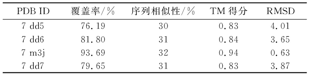 PDB ID覆盖率/%序列相似性/%TM得分RMSD7 dd576.19 300.834.017 dd681.80 310.843.657 m3j93.69 320.940.637 dd779.65 310.833.87