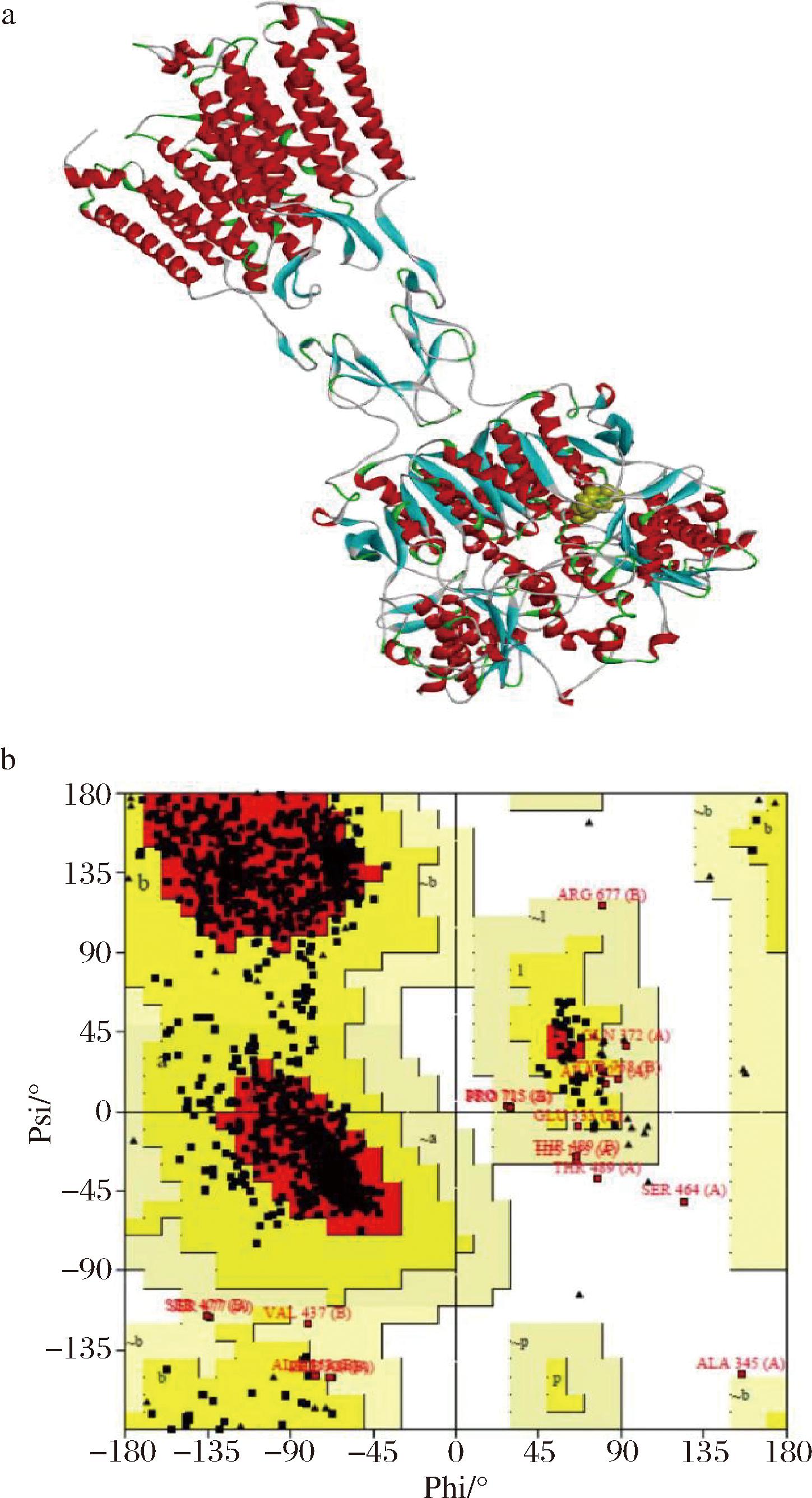 T1R1、T1R3受体的模型图及拉氏图如图1~图2所示。各图中的a图为受体蛋白的模型图,而b图则为拉氏图。模型图可以直观地反映待研究分析的蛋白质分子的主要结构域情况。而在SAVES v6.0平台上输出的拉氏图报告中,每一个正方形小图块代表蛋白质的氨基酸残基,其所在区域的大色块颜色则对应表示如下:红色区域里的氨基酸残基构象是最为合理的,而黄色及粉色区域的氨基酸残基构象为可以接受;最后,白色区域中为不可接受区的氨基酸残基构象。另外,为便于研究者快速评估出蛋白质模型的合理性,SAVES v6.0会在输出的拉式图报告下方提供各氨基酸残基构象在最适区、可接受区和不可接受区的具体比例情况:一般认为,当处于最适区和可接受区的氨基酸残基占比达到90%及以上,则可以认为该蛋白质的模型是比较合理的,可以用于进一步的配体对接研究分析工作[15]。