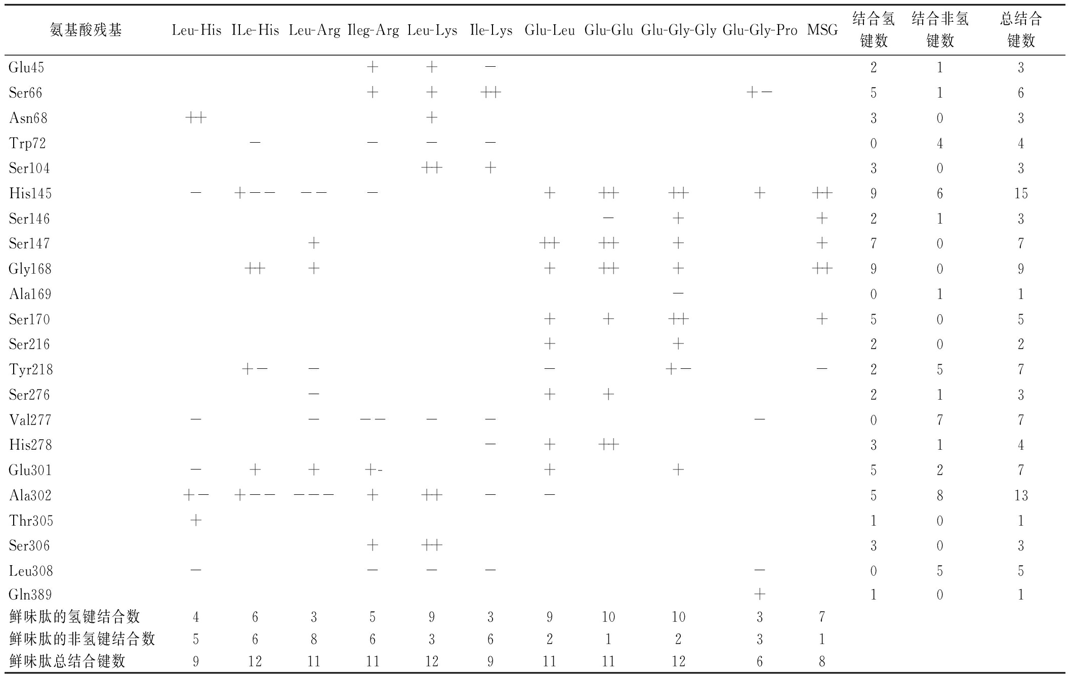 表6和表7中具体统计了10种鲜味肽以及MSG与T1R1的结合位点统计,其中表格左侧为发生结合情况的氨基酸残基,而形成的结合键按照氢键(以1个“+”表示1次结合)与非氢键(以1个“-”表示1次结合)进行计数区分。