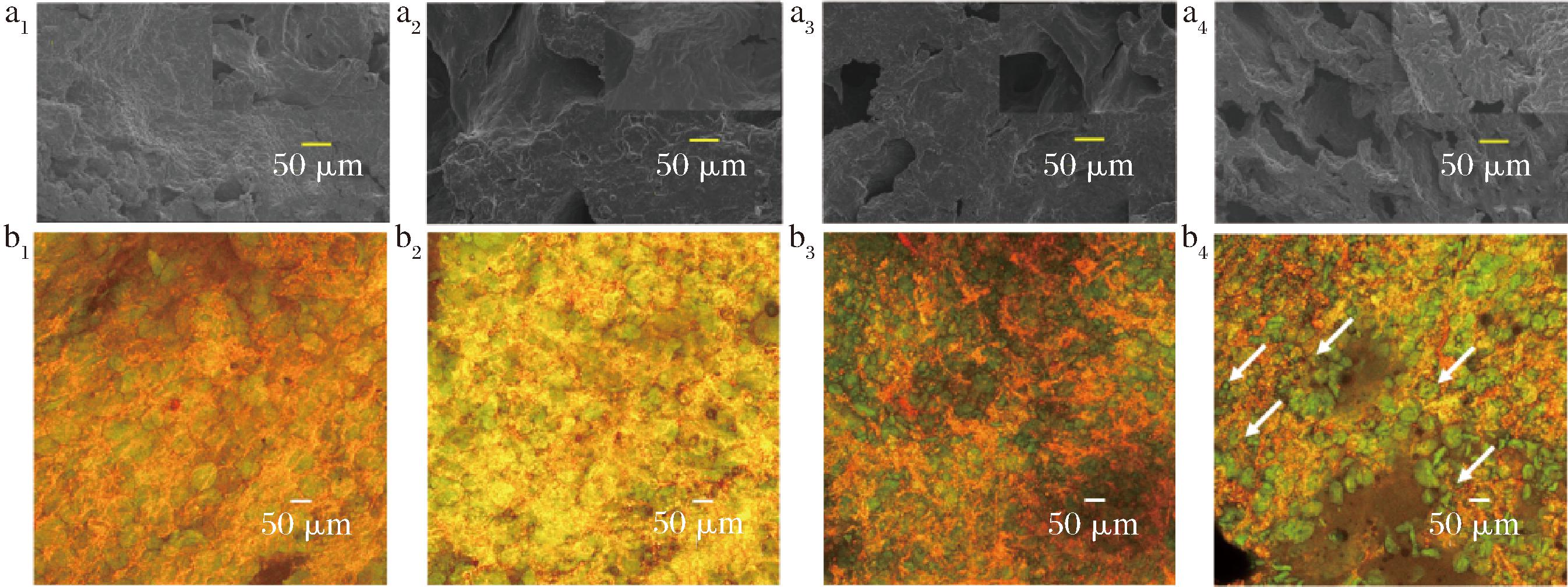 a1-STR-CA的SEM;a2-STR-PGS-CA的SEM;a3-STR-CPS-CA的SEM;a4-STR-VS-CA的SEM;b1-STR-CA的CLSM;b2-STR-PGS-CA的CLSM;b3-STR-CPS-CA的CLSM;b4-STR-VS-CA的CLSM