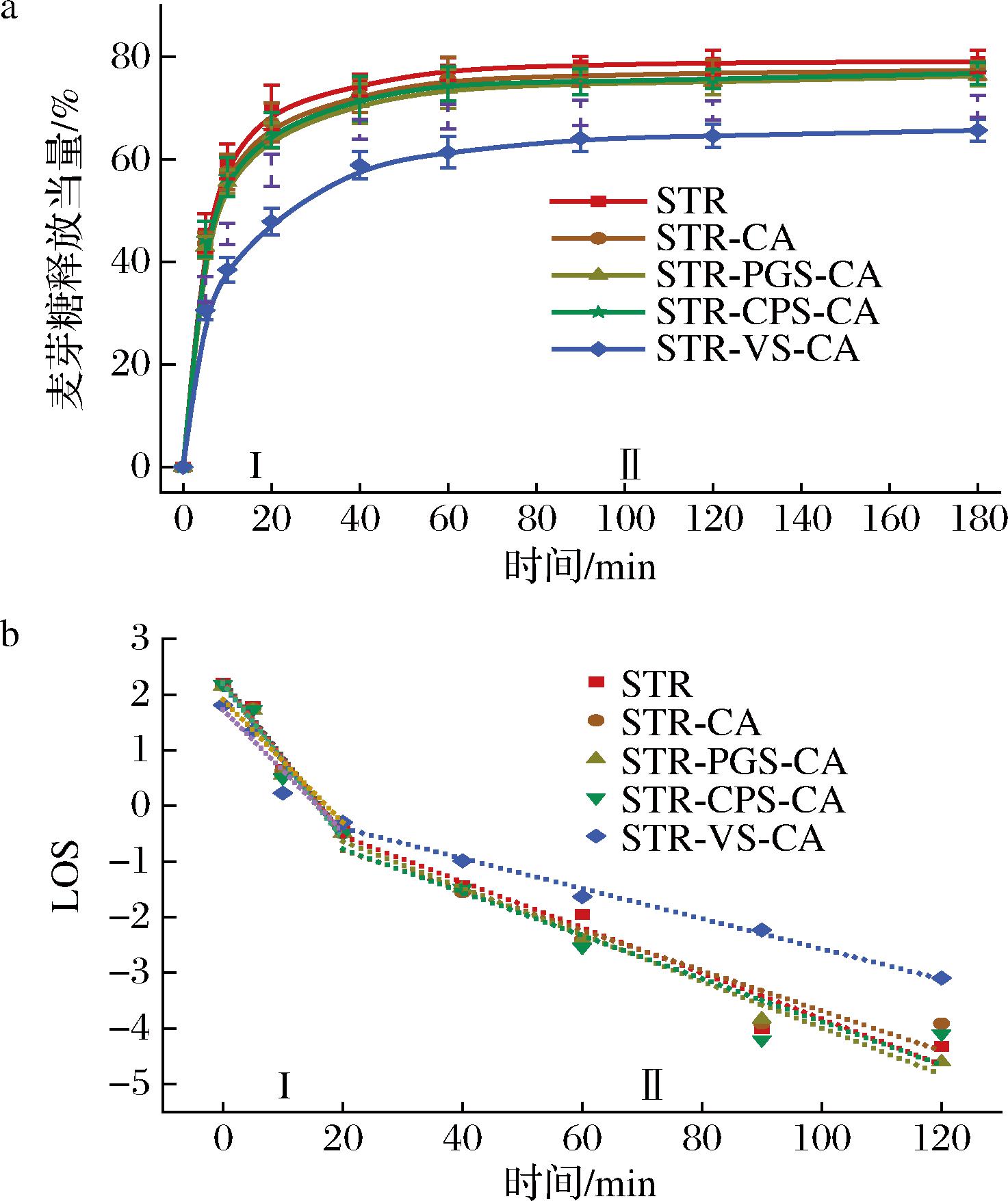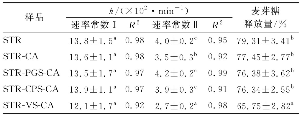 样品k/(×102·min-1)速率常数IR2速率常数ⅡR2麦芽糖释放量/%STR13.8±1.5a0.984.0±0.2c0.9579.31±3.41bSTR-CA13.6±1.1a0.983.5±0.3b0.9277.45±2.77bSTR-PGS-CA13.5±1.7a0.974.2±0.2c0.9976.38±3.62bSTR-CPS-CA13.9±1.1a0.973.9±0.3c0.9176.34±2.55bSTR-VS-CA12.1±1.7a0.922.7±0.2a0.9865.75±2.82a