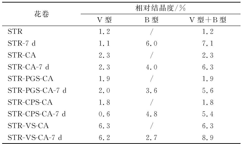 花卷相对结晶度/%V型B型V型+B型STR1.2/1.2STR-7 d1.16.07.1STR-CA2.3/2.3STR-CA-7 d2.34.06.3STR-PGS-CA1.9/1.9STR-PGS-CA-7 d2.03.65.6STR-CPS-CA1.8/1.8STR-CPS-CA-7 d0.64.85.4STR-VS-CA6.3/6.3STR-VS-CA-7 d6.22.78.9