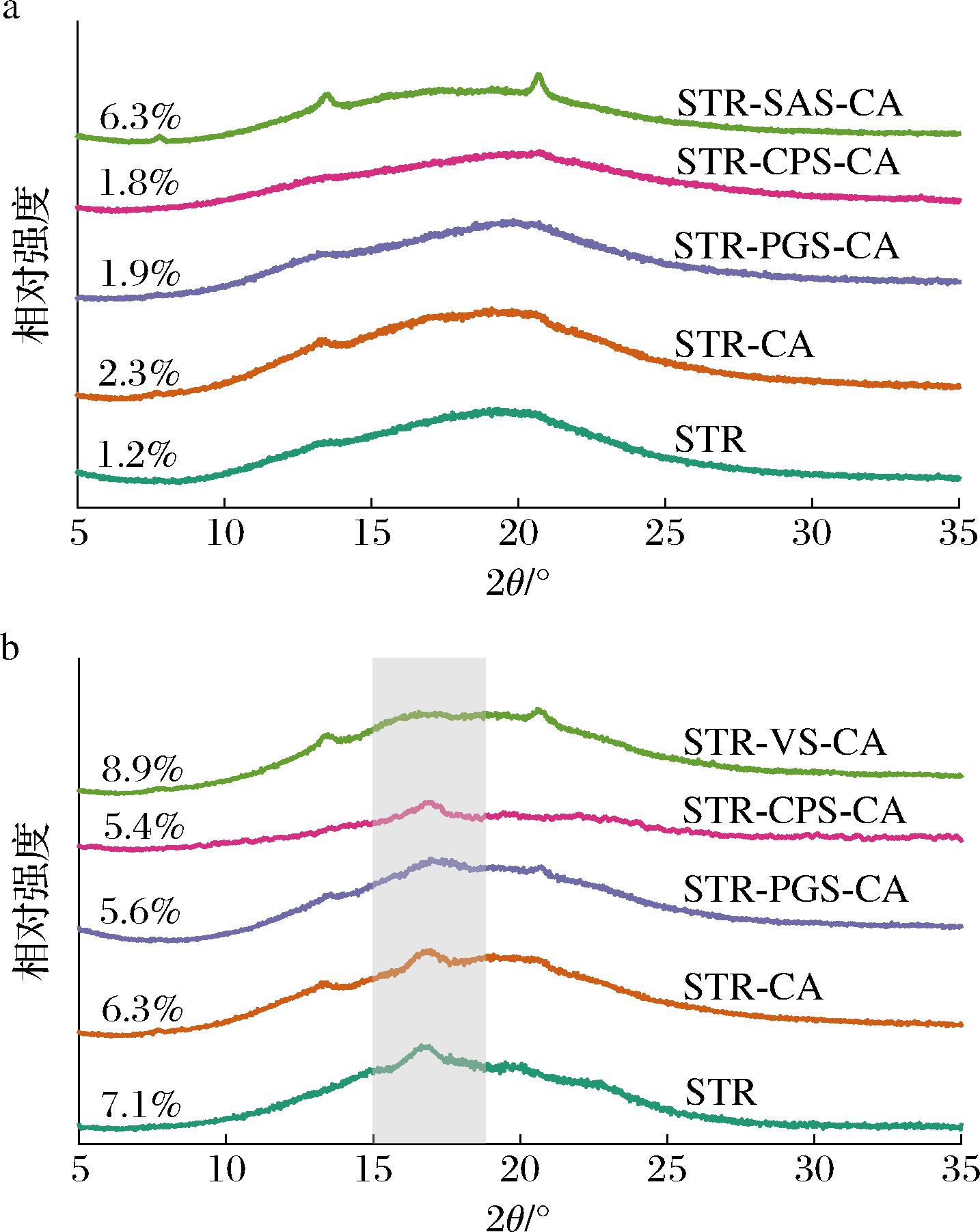 图4为新鲜花卷及冷藏贮存7 d后花卷的XRD,所有新鲜花卷的XRD在13.7°和20.0°左右出现了衍射峰,但强度不同,为淀粉的V型结晶峰,这是由于小麦粉中的直链淀粉与脂肪酸或磷脂形成了V结构。此外,新鲜STR-VS-CA呈现出最高的V型结晶度,与添加的V型淀粉辣椒油微胶囊有关,说明该V型结构在花卷的蒸制过程中被保留下来,具有较高的热稳定性,与之前的结果一致[23]。值得注意的是,由于辣椒油为辣椒素和甘油三酯的混合物,因此微胶囊中的V型结构可能同时包括淀粉与辣椒素/甘油三酯形成的V型结构,但这些结构均具有慢消化特性,对花卷的消化性的降低有积极贡献。此外,花卷在4 ℃贮藏7 d后的V型结晶度几乎没有变化,但B型结晶度均呈现增加趋势。其中,STR增加得最为明显,说明该花卷中淀粉老化速率最快。然而,贮藏7 d后的STR-VS-CA的B型结晶度较低,说明其老化程度最低。之前的研究发现,馒头中淀粉的老化程度与支链淀粉的重结晶相关,而淀粉-脂质复合物可以干扰支链淀粉的重排从而抑制淀粉的老化[24]。