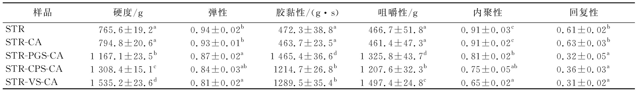样品硬度/g弹性胶黏性/(g·s)咀嚼性/g内聚性回复性STR765.6±19.2a0.94±0.02b472.3±38.8a466.7±51.8a0.91±0.03c0.61±0.02bSTR-CA794.8±20.6a0.93±0.01b463.7±23.5a461.4±47.3a0.91±0.02c0.63±0.03bSTR-PGS-CA1 167.1±23.5b0.87±0.02a1 465.4±36.6d1 325.8±43.7d0.81±0.02b0.32±0.05aSTR-CPS-CA1 308.4±15.1c0.84±0.03ab1214.7±26.8b1 207.6±32.3b0.75±0.05ab0.36±0.03aSTR-VS-CA1 535.2±23.6d0.81±0.02a1289.5±35.4b1 497.4±24.8c0.65±0.02a0.31±0.02a