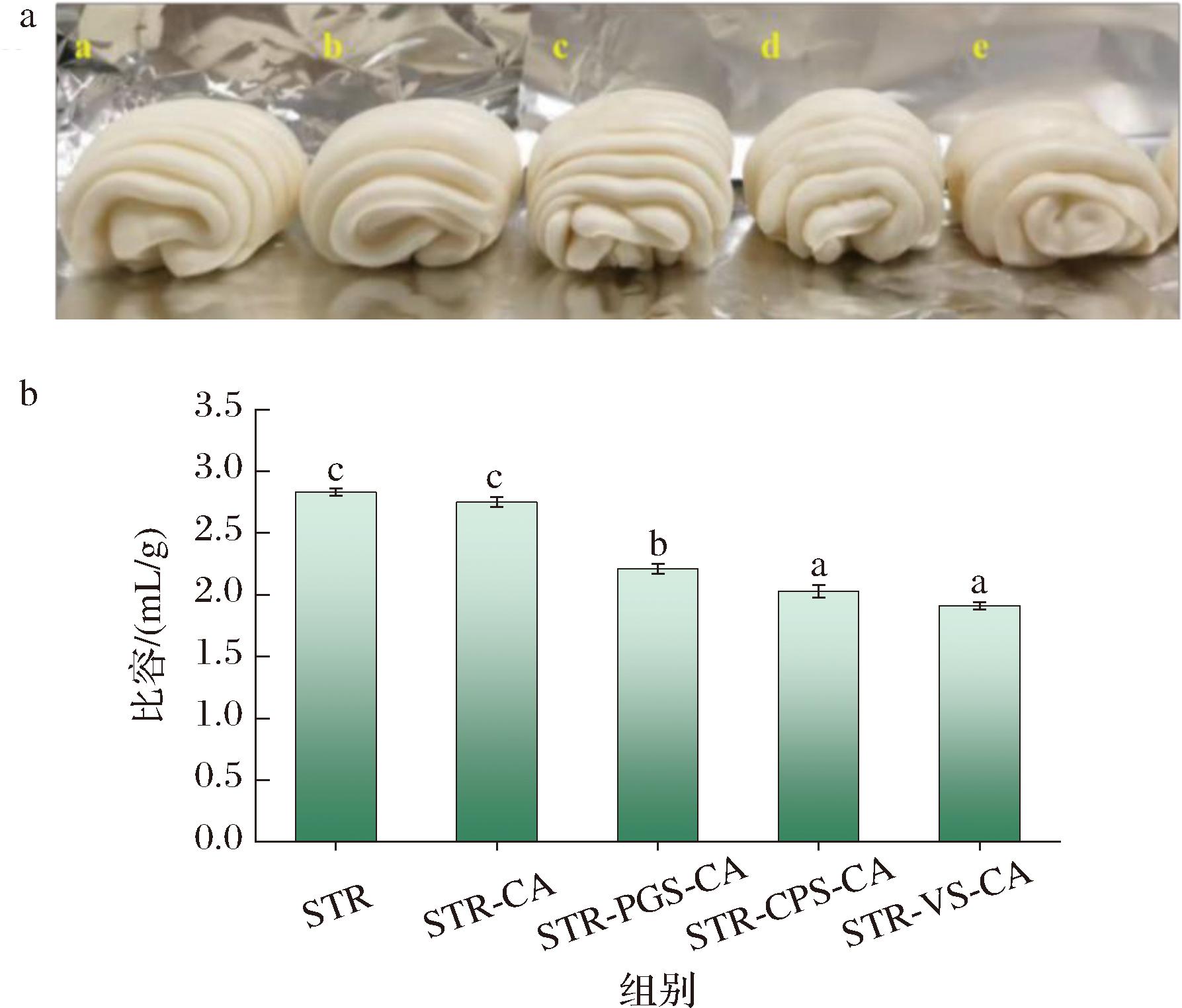 a-花卷外观(从左到右依次为STR、STR-CA、STR-PGS-CA、STR-CPS-CA、STR-VS-CA);b-花卷比容