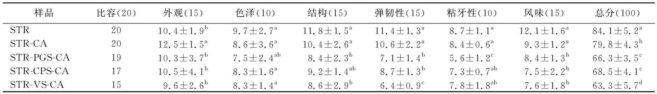 样品比容(20)外观(15)色泽(10)结构(15)弹韧性(15)粘牙性(10)风味(15)总分(100)STR2010.4±1.9b9.7±2.7a11.8±1.5a11.4±1.3a8.7±1.1a12.1±1.6a84.1±5.2aSTR-CA2012.5±1.5a8.6±3.6a10.4±2.6a10.6±2.2a8.4±0.6a9.3±1.2a79.8±4.3bSTR-PGS-CA1910.3±3.7b7.5±2.4ab8.4±2.3b7.1±1.4b5.6±1.2c8.4±1.3b66.3±3.5cSTR-CPS-CA1710.5±4.1b8.3±1.6a9.2±1.4ab8.7±1.3b7.3±0.7ab7.5±2.2b68.5±4.1cSTR-VS-CA159.6±2.6b8.3±1.4a8.6±2.9b6.4±0.9c7.8±1.8ab7.6±1.8b63.3±5.7d