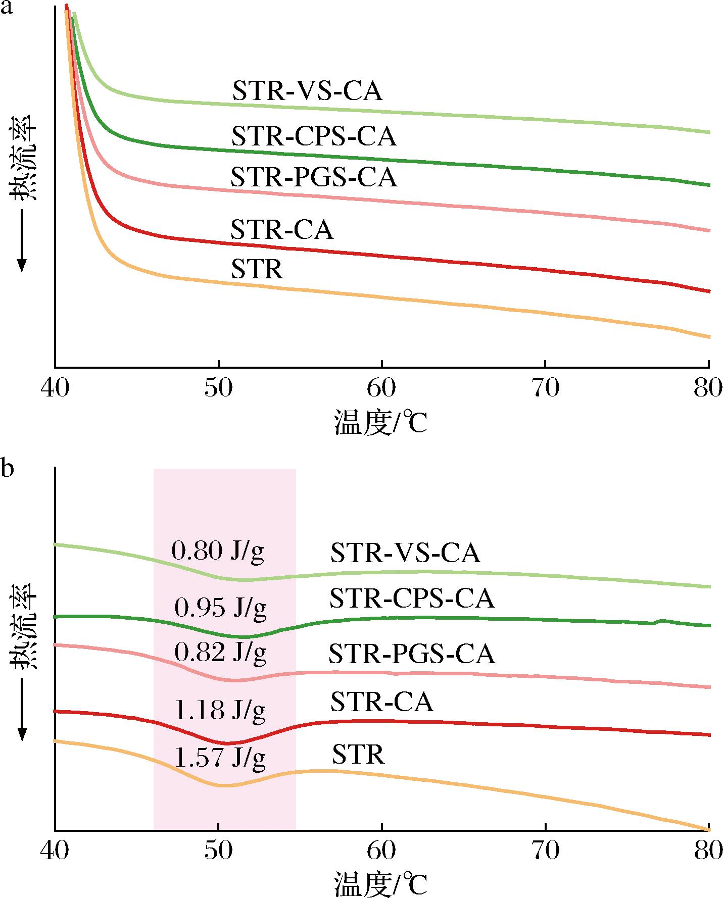 图5为新鲜花卷及冷藏贮存7 d后的DSC测定结果,所有新鲜花卷的DSC在40~80 ℃都没有呈现明显的吸热峰,说明新鲜花卷中不存在淀粉双螺旋结构,这是由于淀粉在蒸制过程发生了糊化,导致双螺旋结构发生破坏。然而,在冷藏7 d后,所有花卷却出现了吸热峰,且吸热峰的峰值温度在50 ℃左右,说明形成了淀粉双螺旋结构,与花卷中淀粉老化有关。此外,对照花卷的老化焓值(1.57 J/g)显著大于STR-VS-CA(0.80 J/g),这与VS-CA的存在干扰了支链淀粉重结晶有关[24]。值得注意的是,STR-PGS-CA的老化焓值也明显低于对照,这是由于预糊化淀粉的持水力较高,降低了花卷中的水分迁移,从而抑制了淀粉老化,与之前的研究结果一致[25]。