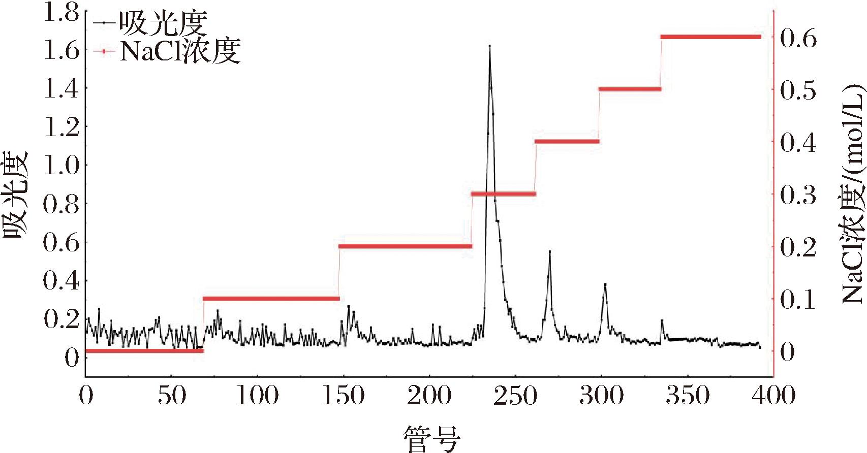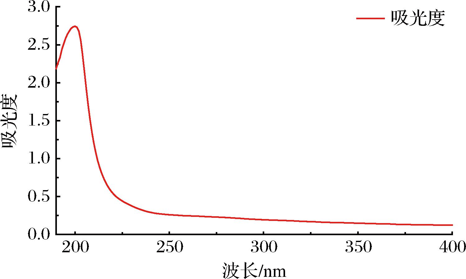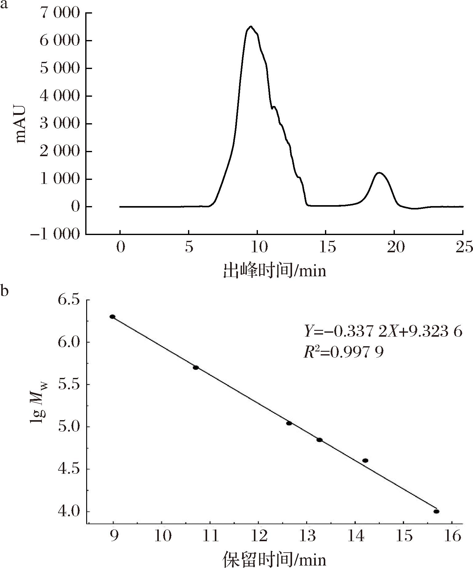图1为TACP在190~400 nm的全波长扫描图谱,其在260~280 nm无吸收峰,表明无核酸和蛋白质的存在。TACP的DEAE柱层析洗脱曲线如图2所示,收集0.3 mol/L NaCl洗脱组分并命名为TAPP,糖含量测定结果表明TAPP中多糖含量达到含量为(91.98±1.53)%。图3-a所示为TAPP的液相色谱图,除溶剂峰外,只有一个保留时间为9.299 min的色谱峰,表明TAPP分子质量分布较为均一。根据图3-b所示葡聚糖标准品lgMw-Rt的标准曲线回归方程(lgMw=-0.337 2Rt+9.323 6,R2=0.997 9)计算得出TAPP分子质量主要集中于1.54×106 Da。
