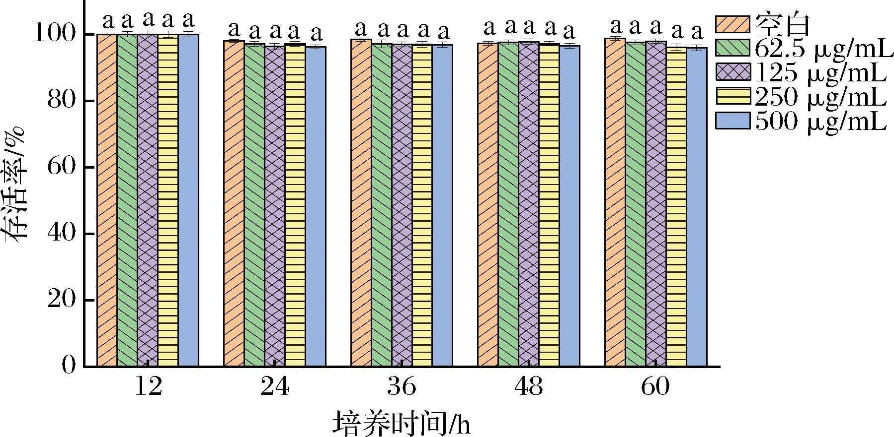 图11所示为不同TAPP浓度对HepG2细胞活力的影响,与正常组相比,加入不同浓度的TAPP(0~500 μg/mL)细胞存活率并未与正常组表现出明显差异,说明TAPP在0~500 μg/mL对HepG2细胞无细胞毒性作用。