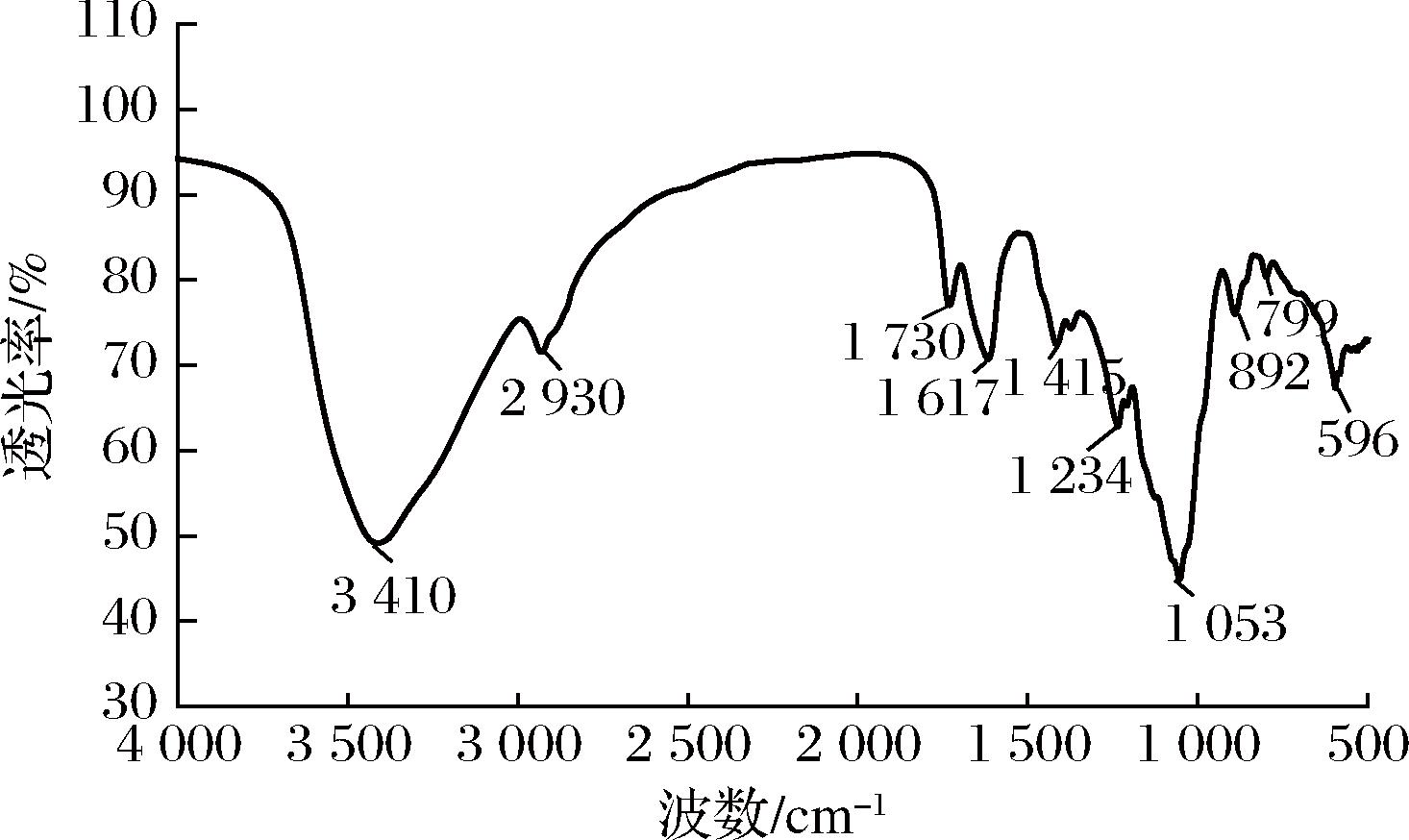 TAPP中的典型化学键在图5所示的FTIR光谱中显示,3 410 cm-1处的宽峰归属于O—H的伸缩振动;2 930 cm-1处的窄峰属于C—H(—CH2)的伸缩振动[20];1 617 cm-1处的尖峰归属于糖半缩醛中CO拉伸振动;1 730 cm-1处的吸收峰归因于酯化的羧基(COO—CH3)的伸缩振动;1 053 cm-1处的峰归属于C—O拉伸振动,属于吡喃糖苷的特征吸收峰,892 cm-1的吸收峰表明存在β-糖苷键[21]。综上表明TAPP的化学键与酸性杂多糖相符合,与单糖组成分析结果相一致。