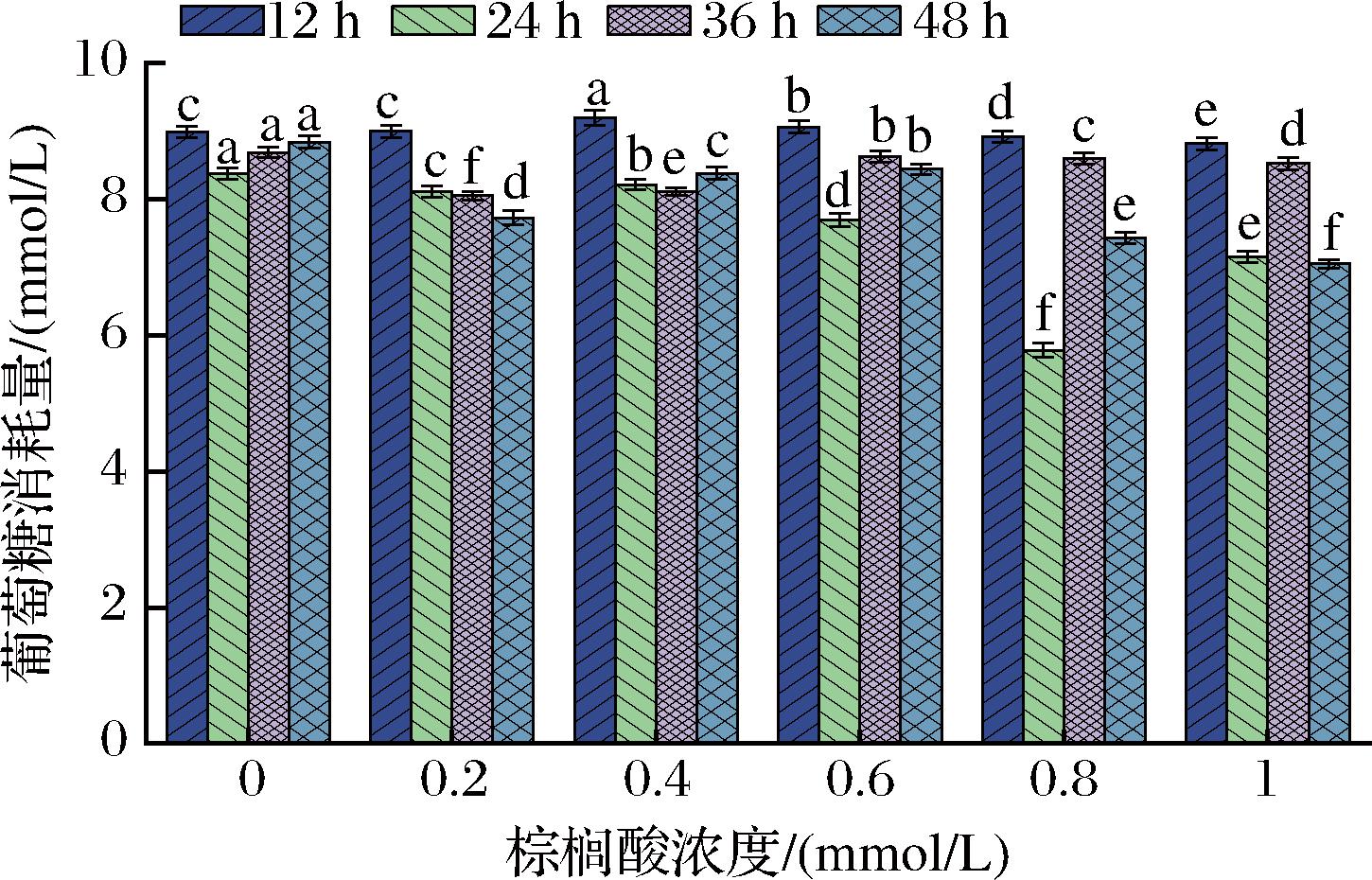 HepG2-IR模型构建:100 μL HepG2细胞悬液96孔板培养贴壁后,移除培养液,生理盐水洗涤2~3次,建模组中分别加入含0.2、0.4、0.6、0.8、1.0 mmol/L棕榈酸培养液,正常组加入普通培养液,每组设置3组平行,分别培养12、24、36、48 h,移除培养液,生理盐水洗涤2~3次,更换普通培养液,孵育24 h,以各组葡萄糖消耗量为指标确定HepG2-IR建模的棕榈酸浓度和作用时间[17],HepG2-IR模型建立后,以普通培养液继续培养,每隔12 h取上清液测定一次葡萄糖消耗量,从而确定模型的持续时间,检测模型的稳定性。