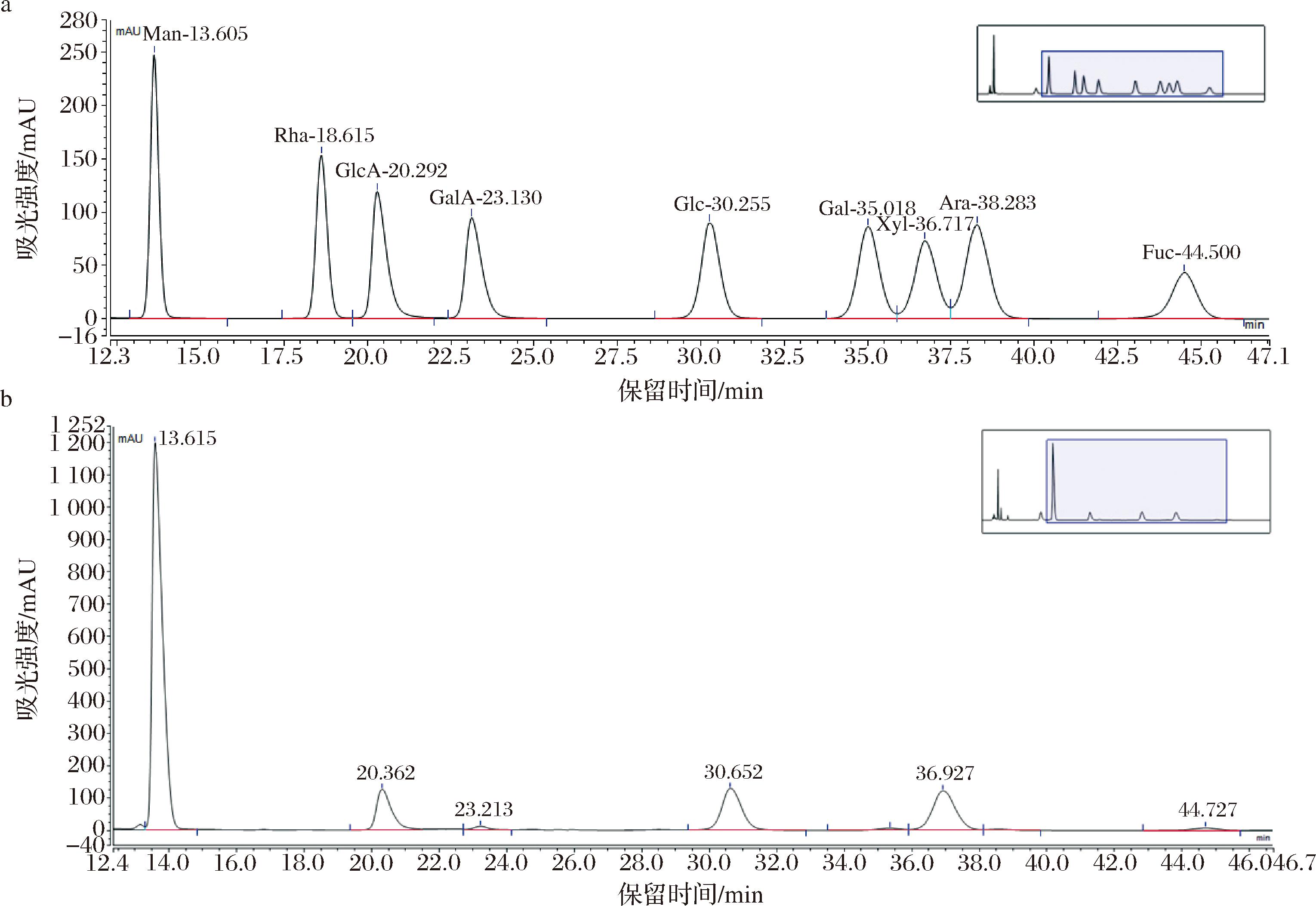 a-单糖标准品的PMP衍生化分析;b-TAPP的PMP衍生化分析