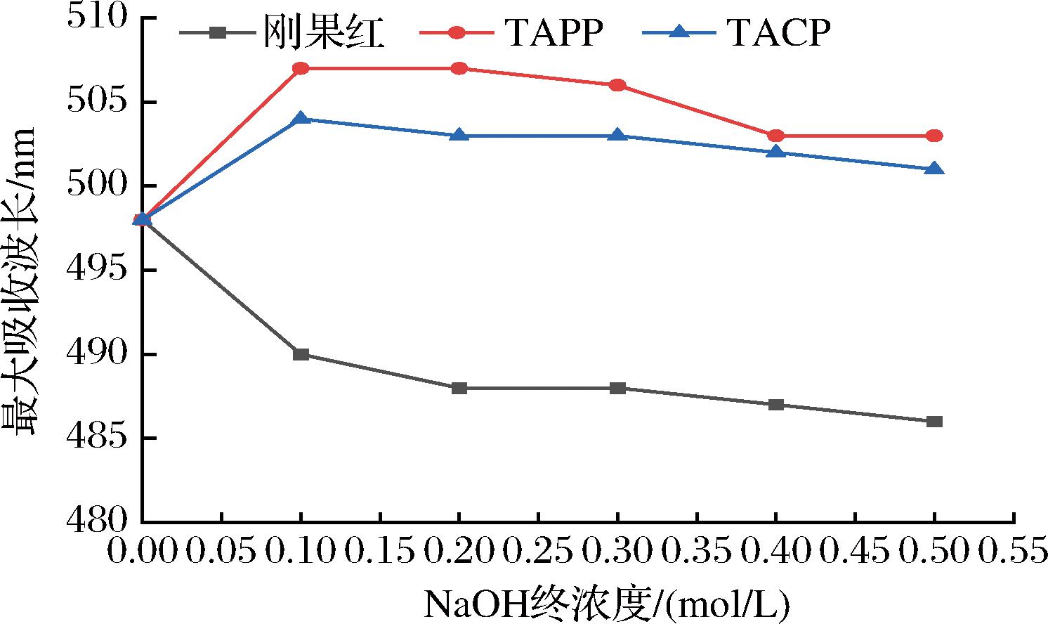 参照汤陈鹏等[14]方法并稍作修改:取2 mL 1 mg/mL的TACP和TAPP溶液分别与2 mL 80 mmol/L的刚果红溶液充分混合,加入1 mol/L NaOH使溶液的氢氧化钠终浓度为 0、0.1、0.2、0.3、0.4、0.5 mol/L。充分混匀后,静置10 min。用紫外-可见分光光度计在波长 400~600 nm范围内扫描。