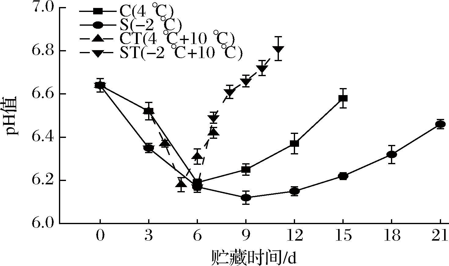 CT组自置于10 ℃后的第2天快速降至最低点6.18,与C组的最低点相近,而后快速上升;ST组于pH值为6.17时置于10 ℃后,pH未再下降,直接上升,在置于10 ℃后的第5天上升至6.81。pH的升高与TVB-N的含量有很强的正相关关系,这与较高pH下特定腐败微生物增殖的有利环境有关[17]。在乌鳢鱼肉置于10 ℃后,pH上升显著,这可能是因为高pH加剧了微生物从糖原依赖型向蛋白质降解型的逐步转变,作用于氨基酸等低分子化合物的微生物和内源性酶在高pH值时生长更加旺盛,分解碱性氨化合物,进而提高pH值[18]。