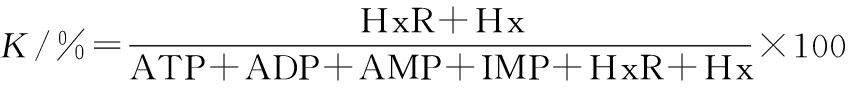 式中:次黄嘌呤核苷(hypoxanthine riboside,HxR),μmol/g;次黄嘌呤(hypoxanthine,Hx),μmol/g;三磷酸腺苷(adenosine triphosphate,ATP)的含量,μmol/g;二磷酸腺苷(adenosine diphosphate,ADP)的含量,μmol/g;一磷酸腺苷(adenosine monophosphate,AMP)的含量,μmol/g;一磷酸肌苷(inosine monophosphate,IMP),μmol/g。
