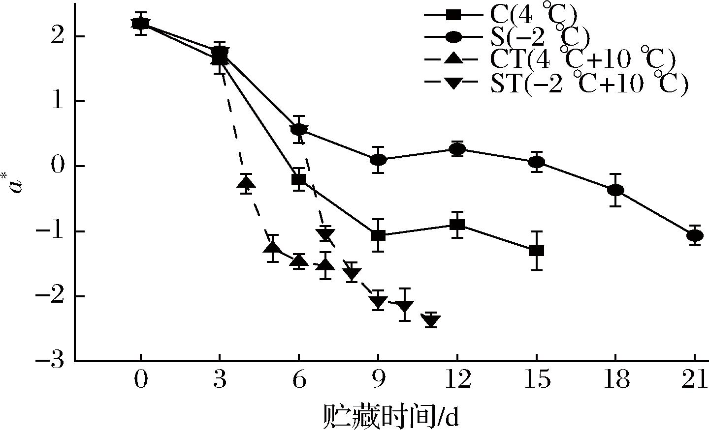 如图10,各组a*值随着贮藏时间的变化皆显著下降(P<0.05)。第0天时,a*值为2.2,在第15天时,C组与S组分别下降至-1.30、0.067;置于10 ℃后的4 d时间里,CT组从1.63下降至-1.53,而ST组从0.57下降至-2.13。C组降幅要大于S组,CT组的降幅大于ST组,这一方面是因为贮藏过程中,S组微冻较低的温度减缓了肌红蛋白血色素中的亚铁离子被氧化成铁离子,形成高铁肌红蛋白的速度,使得鱼肉a*值降低的幅度小于C组;另一方面是因为随着贮藏时间的延长,鱼肉中的蛋白质会发生降解以及色素与肌肉蛋白结合的现象[30],使a*值降低,而微冻可以减缓蛋白质的降解,这与下文MP的测定结果相似。