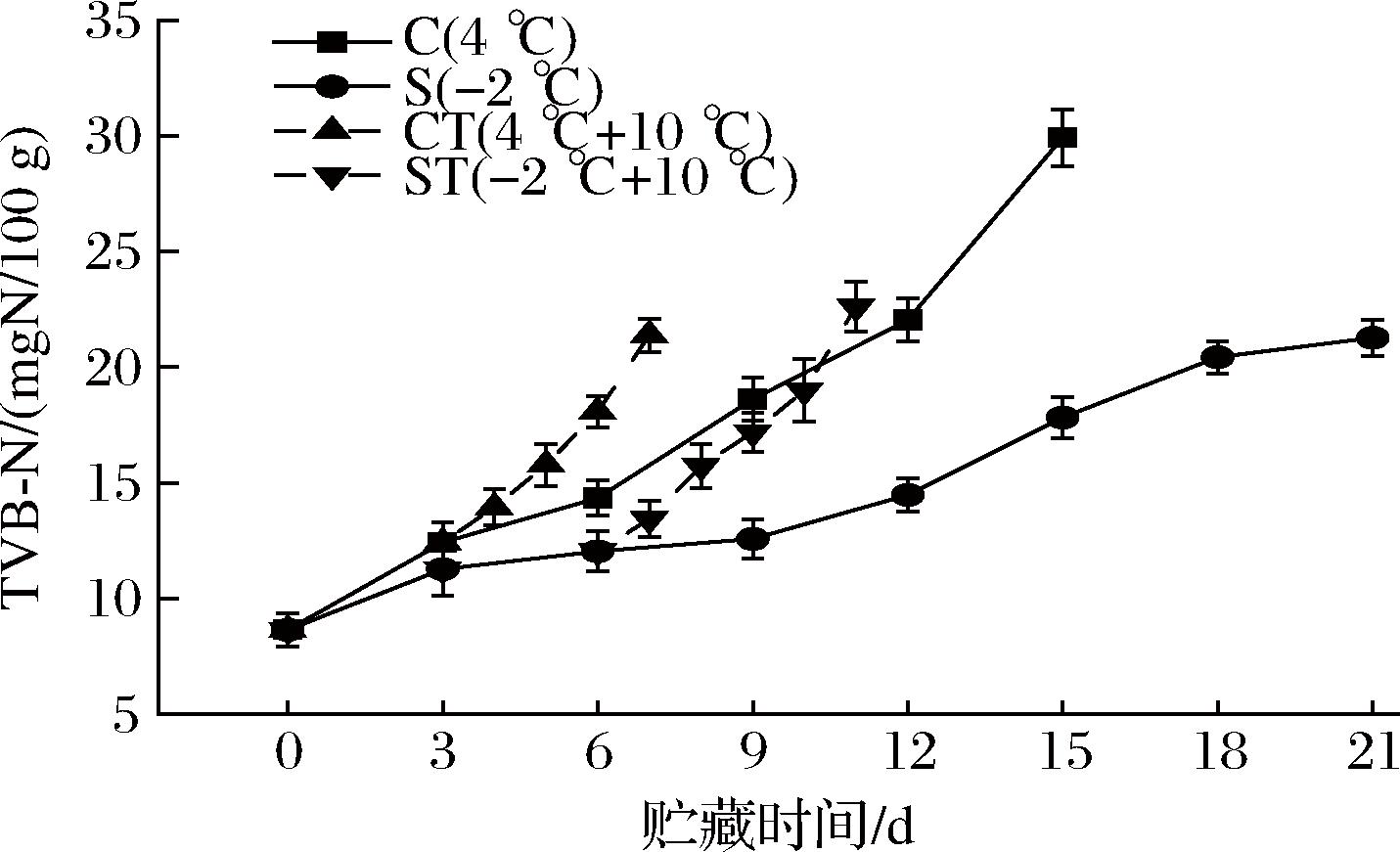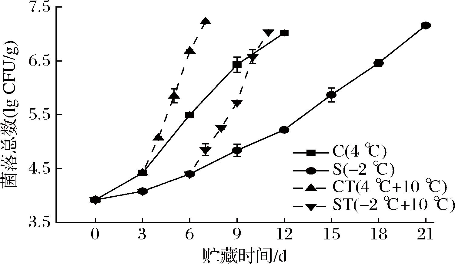 乌鳢贮藏期间菌落总数的变化如图2所示。乌鳢鱼肉的初始菌落总数为3.92 lg CFU/g,C组的菌落总数在鱼肉贮藏期间快速增加,在第12天到达7.02 lg CFU/g,超过了国际微生物规格委员会(ICMSF)食品微生物限量规定[13]对于淡水鱼的微生物的可接受极限(7.00 lg CFU/g)。S组鱼肉菌落的生长显著慢于C组(P<0.05),在第21天时达到7.16 lg CFU/g,比C组晚9 d超过可接受极限。CT组与ST组在贮藏第3天、第6天置于10 ℃后,分别在第6天、第9天时达到6.68 lg CFU/g、5.73 lg CFU/g,此时C组第6天的菌落总数为5.50 lg CFU/g,S组第9天的菌落总数为4.84 lg CFU/g,置于10 ℃后,CT组与ST组菌落总数快速增加。CT组在置于10 ℃后的第4天达到7.23 lg CFU/g,ST组在置于10 ℃后的第5天达到7.04 lg CFU/g,超过食用极限,2组菌落总数增加速度相近,无显著差异。微冻对于鱼肉的菌落生长的抑制作用优于冷却贮藏,这与ELIASSON等[14]在考察微冻对大西洋鳕鱼货架期影响时的结果相似,微冻使鱼肉内5%~30%的水分冻结,细胞胞浆浓度增加,抑制了微生物活性,减缓了微生物繁殖的速度[15]。