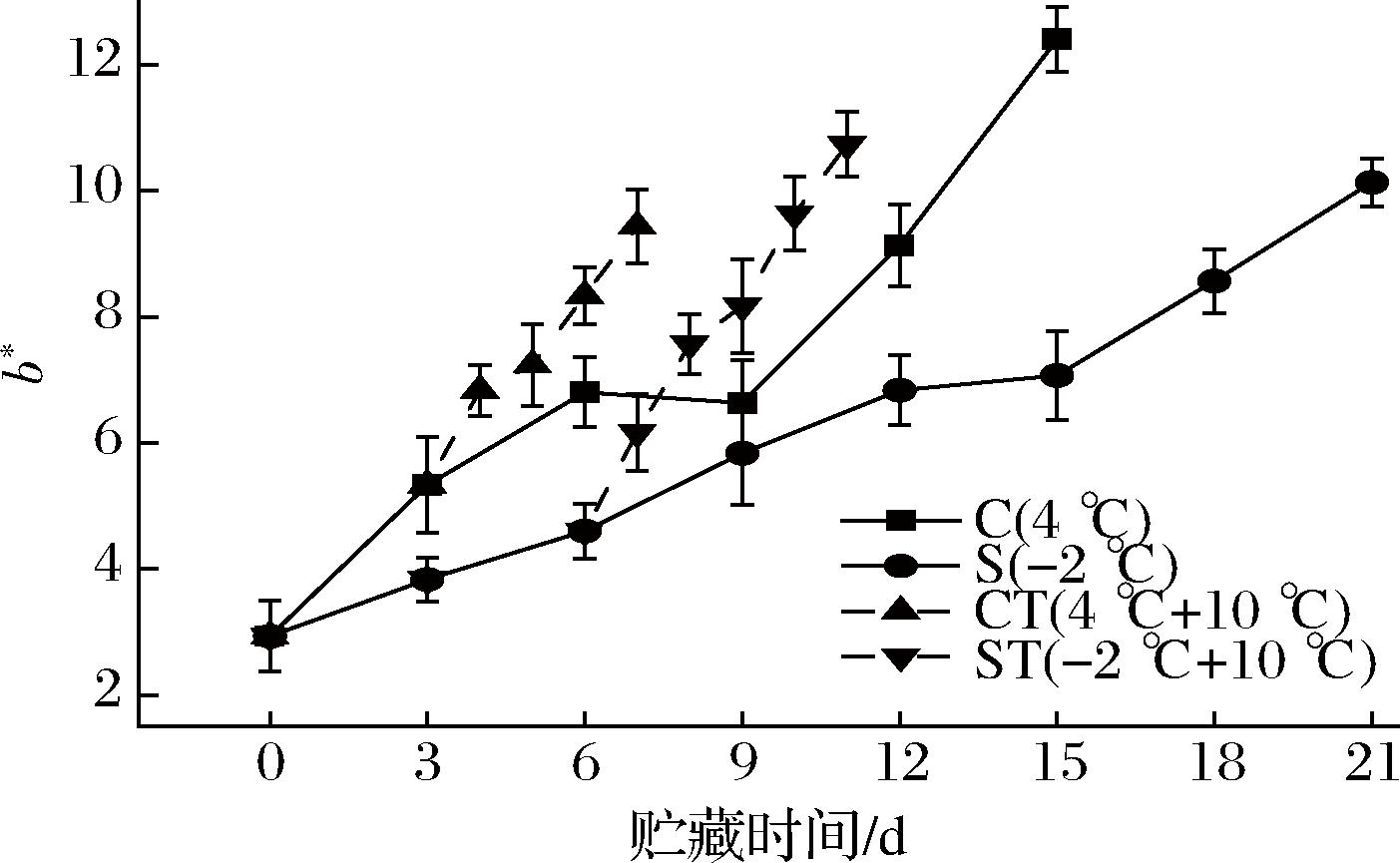 如图11所示,随着贮藏时间的延长,各组b*值显著上升(P<0.05)。第0天时,b*值为2.93,C组与S组在第15天时分别增加至12.40、7.07;在置于10 ℃后的4 d时间里,CT组从5.33增至9.43,而ST组从4.60增至9.63,贮藏末期的b*值相似。鱼肉中的脂肪和一些成分会发生氧化,氧化产物(如不饱和脂肪酸的氧化产生的醛、酮等化合物)可能呈现出黄色;而蛋白质逐渐变性和降解,其结构的改变可能会影响它与色素分子的结合,加上蛋白质降解产物可能具有黄色调,使得b*值上升。C组b*值增幅大于S组,CT组b*值增幅大于ST组,这可能因为微冻贮藏减缓了脂肪氧化的程度,而CT组ST组末期的b*值结果相近,也与上文TBA的测定结果相吻合。