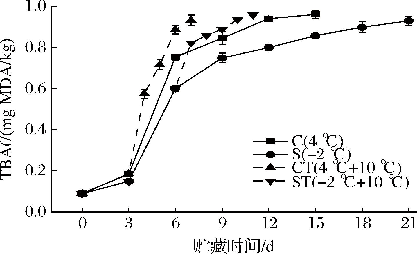 TBA是可以反映水产品脂质氧化程度的指标。丙二醛(malondialdehyde,MDA)是多不饱和脂肪酸氧化过程中形成的脂质氢过氧化物和过氧化物的降解产物之一,通过一个分子的MDA与2个分子的2-硫代巴比妥酸反应,形成粉红色络合物的分光光度进行测定[19]。如图5所示,贮藏过程中,各组TBA值都呈上升趋势,在第3天到第6天时,都显著增加(P<0.05)。贮藏的第6天,C组冷却贮藏的TBA从初始的0.09 mg MDA/kg快速升高到0.75 mg MDA/kg后,上升趋势变缓,而S组微冻贮藏在0.60 mg MDA/kg后就开始变缓,上升幅度小于C组,在第15天时,C组TBA达到0.96 mg MDA/kg,此时S组为0.86 mg MDA/kg,说明微冻可以减缓脂质的氧化,可能是因为低温抑制乌鳢鱼肉内脂肪氧化酶的活性,这与陈依萍等[20]对于微冻鲟鱼肉脂肪氧化所描述的一致。而ST组微冻后置于10 ℃的鱼肉开始的TBA值比CT组冷却后置于10 ℃的鱼肉较高,在贮藏后期趋于一致,这可能是因为微冻给乌鳢肌肉造成的机械性损伤所致。